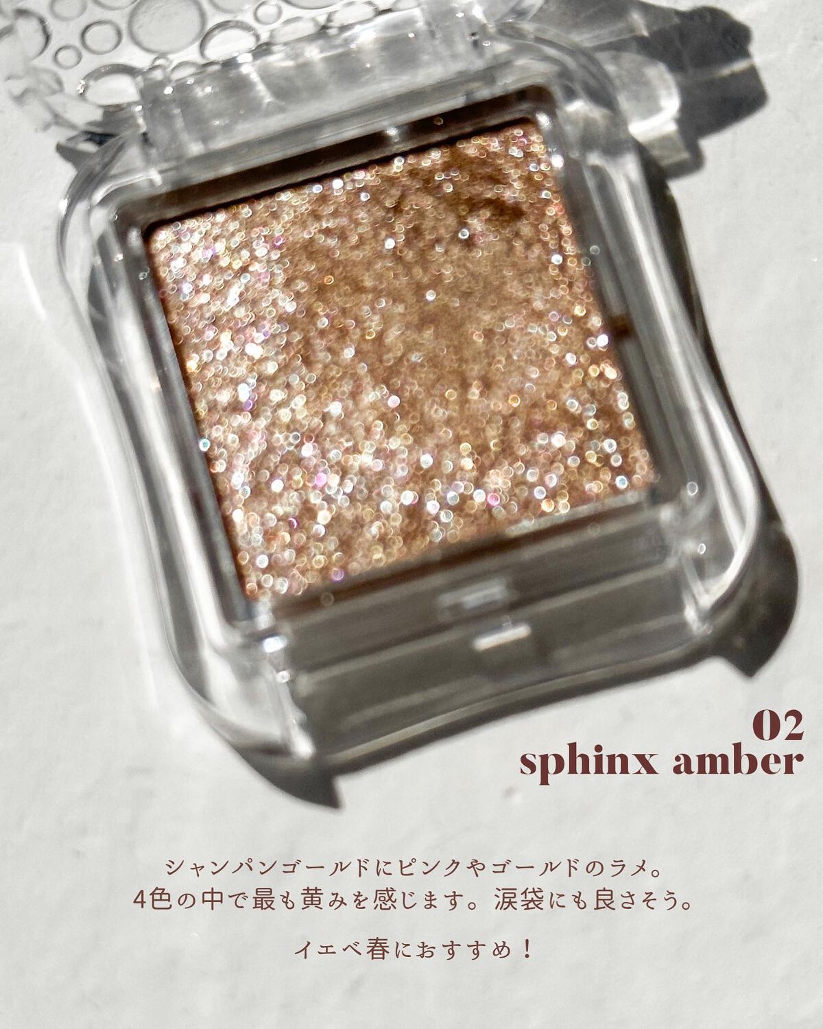 - <01 ラセットブラウン> タルク、ホホバ種子油、リンゴ酸ジイソステアリル、ジメチコン、ワセリン、(HDI/トリメチロールヘキシルラクトン)クロスポリマー、1,2-ヘキサンジオール、メタクリル酸メチルクロスポリマー、シリカ、イソステアリン酸ソルビタン、トコフェロール、スクワラン、セラミドNP、水、ヒアルロン酸Na、メチルパラベン、BG、フェノキシエタノール、水溶性コラーゲン、エチルパラベン、マイカ、酸化鉄、合成フルオロフロゴパイト、ホウケイ酸(Ca/Al)、酸化チタン、酸化スズ <02 スフィンクスアンバー> タルク、ホホバ種子油、リンゴ酸ジイソステアリル、ジメチコン、ワセリン、(HDI/トリメチロールヘキシルラクトン)クロスポリマー、シリカ、1,2-ヘキサンジオール、メタクリル酸メチルクロスポリマー、イソステアリン酸ソルビタン、トコフェロール、スクワラン、セラミドNP、水、ヒアルロン酸Na、メチルパラベン、BG、フェノキシエタノール、水溶性コラーゲン、エチルパラベン、マイカ、ホウケイ酸(Ca/Al)、酸化鉄、合成フルオロフロゴパイト、酸化チタン、酸化スズ <03 オーキッドモーヴ> タルク、ホホバ種子油、リンゴ酸ジイソステアリル、ジメチコン、ワセリン、(HDI/トリメチロールヘキシルラクトン)クロスポリマー、1,2-ヘキサンジオール、メタクリル酸メチルクロスポリマー、シリカ、イソステアリン酸ソルビタン、トコフェロール、スクワラン、セラミドNP、水、ヒアルロン酸Na、メチルパラベン、BG、フェノキシエタノール、水溶性コラーゲン、エチルパラベン、合成フルオロフロゴパイト、ホウケイ酸(Ca/Al)、酸化鉄、グンジョウ、マイカ、酸化チタン、アルミナ、水酸化Al、赤226、酸化スズ <04 シャモアピンク> タルク、ホホバ種子油、リンゴ酸ジイソステアリル、ジメチコン、ワセリン、(HDI/トリメチロールヘキシルラクトン)クロスポリマー、1,2-ヘキサンジオール、メタクリル酸メチルクロスポリマー、シリカ、イソステアリン酸ソルビタン、トコフェロール、スクワラン、セラミドNP、水、ヒアルロン酸Na、メチルパラベン、BG、フェノキシエタノール、水溶性コラーゲン、エチルパラベン、マイカ、合成フルオロフロゴパイト、ホウケイ酸(Ca/Al)、酸化鉄、酸化チタン、酸化スズ
