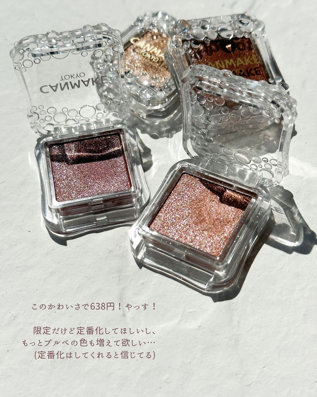 ラメ好きさん必見のキラキラアイシャドウ💎✨ キャンメイクのラメ好き担当者さん渾身の新作だそうです👏 多色の大粒パールと小粒パールを混ぜることで、発光しているようなきらめきと、濡れ感のあるうるうるとした輝きに。 ラメ落ちすることもなくピタッとフィットします🪄 涙袋や黒目の上はもちろん、自由に楽しんでみてください✨