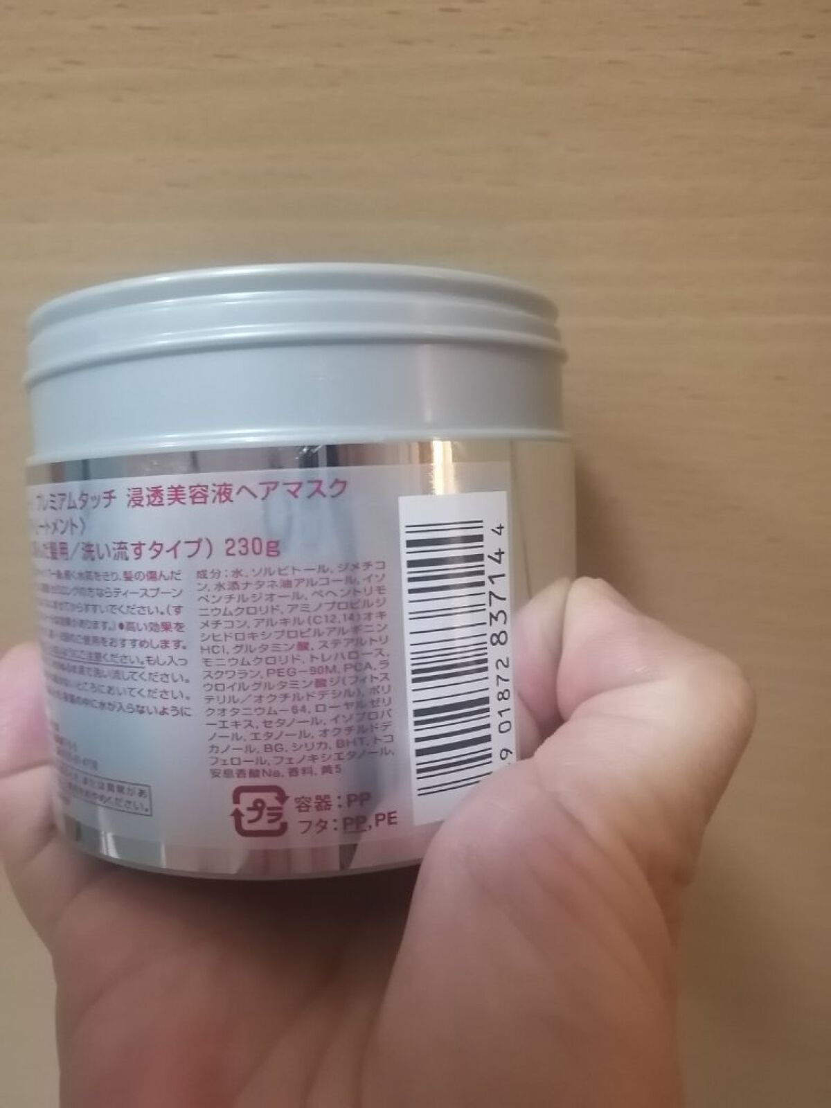 - <本体230g> 水、ソルビトール、ジメチコン、水添ナタネ油アルコール、イソペンチルジオール、ベヘントリモニウムクロリド、アミノプロピルジメチコン、アルキル(C12、14)オキシヒドロキシプロピルアルギニンHCl、ステアリルジヒドロキシプロピルジモニウムオリゴ糖、グルタミン酸、トレハロース、スクワラン、ステアルトリモニウムクロリド、PEG-90M、PCA、ラウロイルグルタミン酸ジ(フィトステリル/オクチルドデシル)、加水分解コムギタンパク、ポリクオタニウム-64、加水分解コムギデンプン、ローヤルゼリーエキス、イソプロパノール、セタノール、オクチルドデカノール、エタノール、PG、BG、トコフェロール、フェノキシエタノール、安息香酸Na、香料、黄5 <つめかえ用700g> 水、ソルビトール、ジメチコン、水添ナタネ油アルコール、イソペンチルジオール、ベヘントリモニウムクロリド、アミノプロピルジメチコン、アルキル(C12、14)オキシヒドロキシプロピルアルギニンHCl、ステアリルジヒドロキシプロピルジモニウムオリゴ糖、グルタミン酸、トレハロース、スクワラン、ステアルトリモニウムクロリド、PEG-90M、PCA、ラウロイルグルタミン酸ジ(フィトステリル/オクチルドデシル)、加水分解コムギタンパク、ポリクオタニウム-64、加水分解コムギデンプン、ローヤルゼリーエキス、イソプロパノール、セタノール、オクチルドデカノール、エタノール、PG、BG、トコフェロール、フェノキシエタノール、安息香酸Na、香料、黄5 <ピンクリボン(230g)> シリカ、水、BG、ジメチコン、ソルビトール、フェノキシエタノール、スクワラン、香料、トコフェロール、エタノール、ローヤルゼリーエキス、セタノール、トレハロース、イソペンチルジオール、イソプロパノール、ベヘントリモニウムクロリド、ポリクオタニウム-64、PCA、PEG-90M、黄5、BHT、ラウロイルグルタミン酸ジ(フィトステリル/オクチルドデシル)、水添ナタネ油アルコール、グルタミン酸、オクチルドデカノール、安息香酸Na、ステアルトリモニウムクロリド、アミノプロピルジメチコン、アルキル(C12、14)オキシヒドロキシプロピルアルギニンHCI
