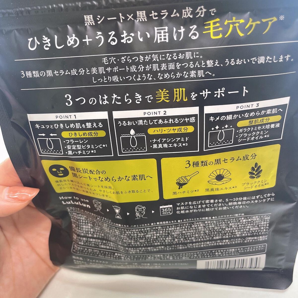 - ルルルンハイドラシリーズから新登場。 備長炭配合の黒シート×黒セラム成分でひきしめ+うるおい届ける毛穴ケア※。 毛穴・ざらつきが気になるお肌におすすめです。3種類の黒セラム美容液と美肌サポート成分がお肌の表面をつるんと整え、うるおいで満たします。 しっとり吸い付くような、なめらかな素肌へ。(※肌をひきしめ、毛穴を目立たなくすること)