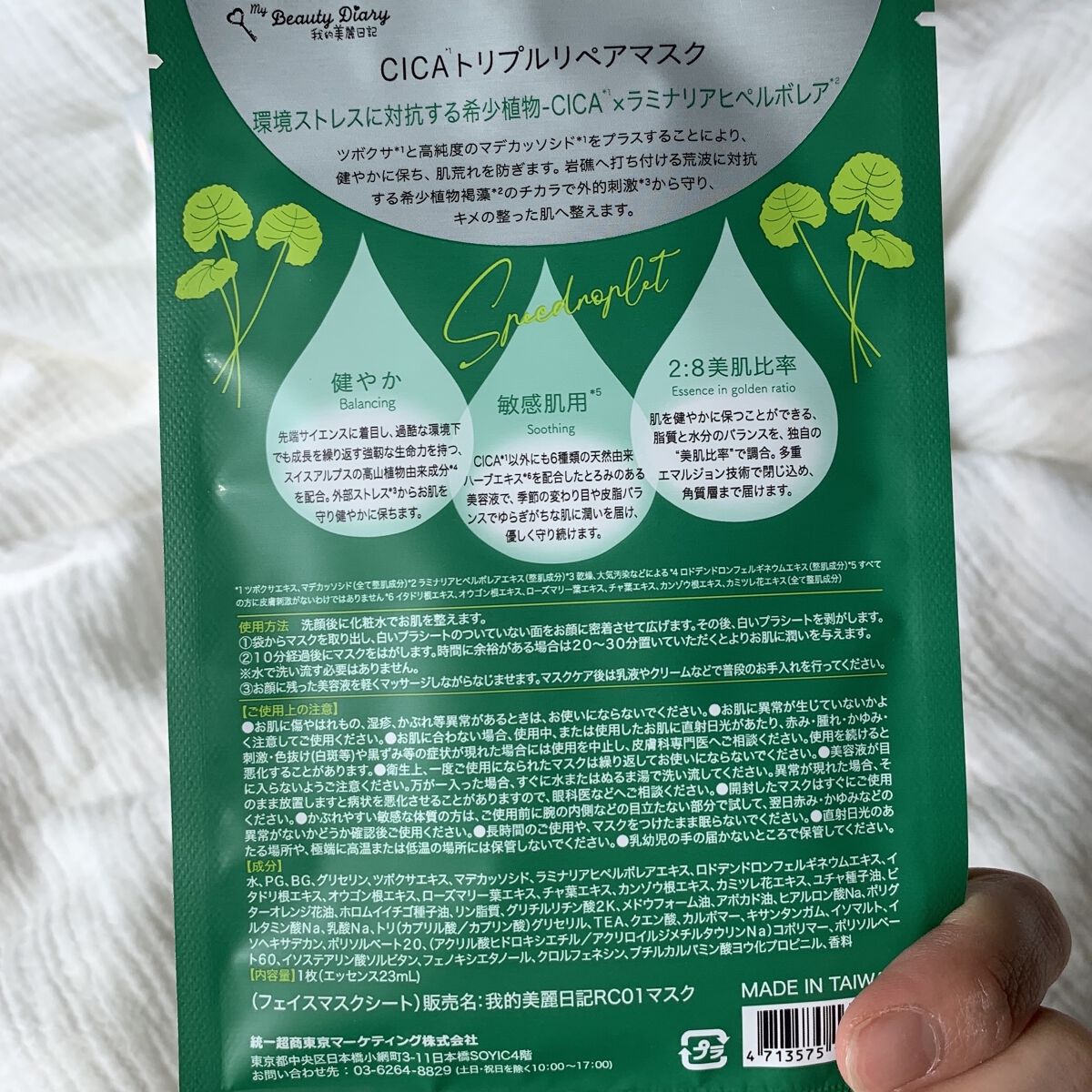 - 我的美麗日記からCICAマスク登場!! 環境ストレスに対抗する植物- CICA*1×ラミナリアヒペルボレア*2 ツボクサ*1と高純度のマデカッソシド*1をプラスし、肌荒れを防ぎます。 希少植物褐藻*2のチカラで乾燥等の外的刺激から守り、キメの整った肌へ整えます。 健やか Balancing 過酷な環境下で成長を繰り返す、スイスアルプスの高山植物由来成分*3を配合。外部ストレスからお肌を守り健やかに保ちます。 敏感肌用*4 Soothing 6 種類の天然由来ハーブエキス*5を配合した美容液で、ゆるぎがちな肌に潤いを届け、優しく守り続けます。 2:8美肌比率 Essence in golden ratio 脂質と水分のバランスを、独自の""美肌比率""で調合し、肌を健やかに保ちます。多重エマルジョン技術で閉じ込め、角質層まで届けます。 ◆我的美麗日記のこだわり◆ パラベン、アルコールを配合していません。また、鉱物油、色素、蛍光剤を使用していません。 *1ツボクサエキス、マデカッソシド(全て整肌成分)*2ラミナリアヒペルボレアエキス(整肌成分)*3ロドデンドロンフェルギネウムエキス(整肌成分)*4すべての方に皮膚刺激がないわけではありません*5イタドリ根エキス、オウゴン根エキス、ローズマリー葉エキス、チャ葉エキス、カンゾウ根エキス、カミツレ花エキス(全て整肌成分) 使い方 事前に洗顔後に化粧水でお肌を整えます。 1、袋からマスクを取り出しお顔全体に広げる。白いプラシートははがす。 2、10分経過後にマスクをはがす。時間に余裕がある場合は20~30分置いていただくとよりお肌に潤いを与えます。 3、お顔に美容液が残っている時は、指先で軽くマッサージしながらなじませる。※水で洗い流す必要はありません。マスクケア後は乳液やクリームなどで普段のお手入れを行ってください。