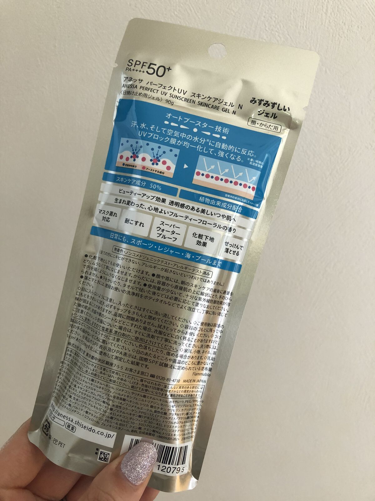 - SPF50+ ・ PA++++ 顔・ から だ用 汗、水、そして空気中の水分※10 に反応してUVブロック膜が強くなる技術搭載 毎日つけたくなる みずみずしいスキンケア UVジェル ※10 暑い時期の高湿度環境 〇汗、水、そして空気中の水分に自動的に反応して 、 UVブロック膜が 強くなります 。-オートブースタ ー 技術 〇透明美肌仕上げ-ビューティ ー アップ 〇スキンケア成分50%配合 〇保湿成分:コラーゲン、スーパーヒアルロン酸※9、グリセリン ※9 アセチルヒアルロン酸Na 〇長時間保湿持続効果 〇スーパーウォータープルーフ 〇マスク蒸れ対応 〇耐こすれ 〇化粧下地効果 〇せっけんで落とせる 〇みずみずしいジェル 〇生まれ変わった、心地よいフルーティーフローラルの香り 〇大気中に浮遊する微粒子、PM2.5などから肌を保護します。 -微粒子付着防止対応 〇海に流れ出にくいオーシャンフレンドリー処方※6 ※6 自社品内の耐水処方でない商品と比較 〇植物由来の原料を一部使用した袋 〇無着色・ノンコメドジェニックテスト・アレルギーテスト済み (全ての方にニキビができない、アレルギーが起きないというわけではありません)