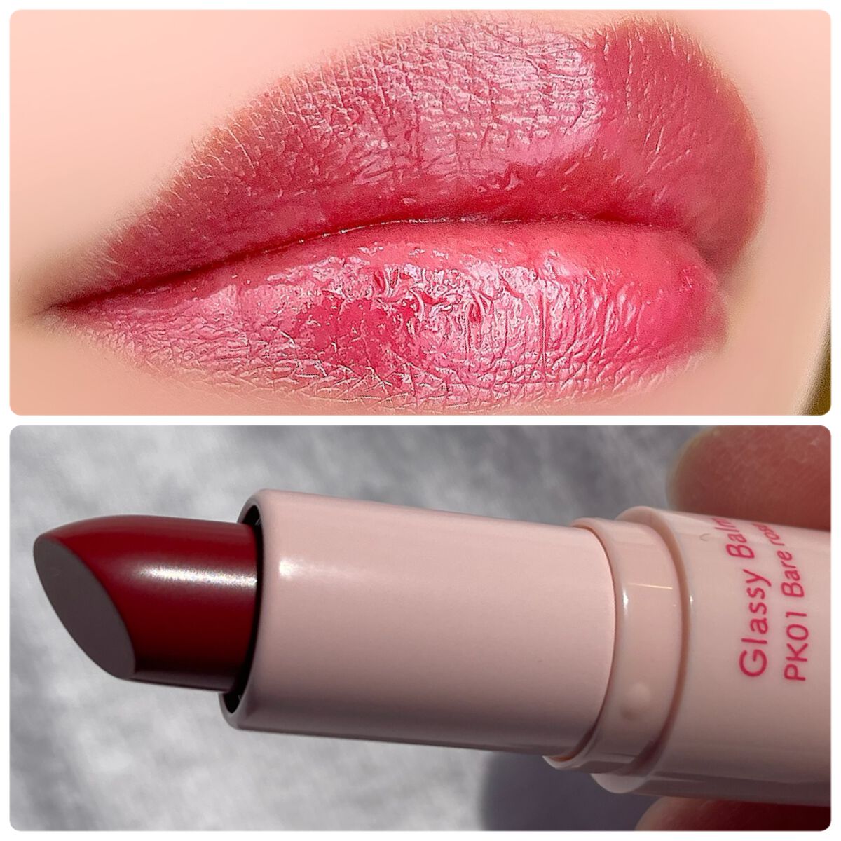血色感リップ🫧 &nd by rom&nd グラッシーバーム PK01ベアローズ ¥880 ポケットに入るくらいのミニサイズなのにかなり優秀でかわいいリップです! 見た目は濃い赤にみえますが、塗ってみるとナチュラルで透け感のあるローズピンクです🩰