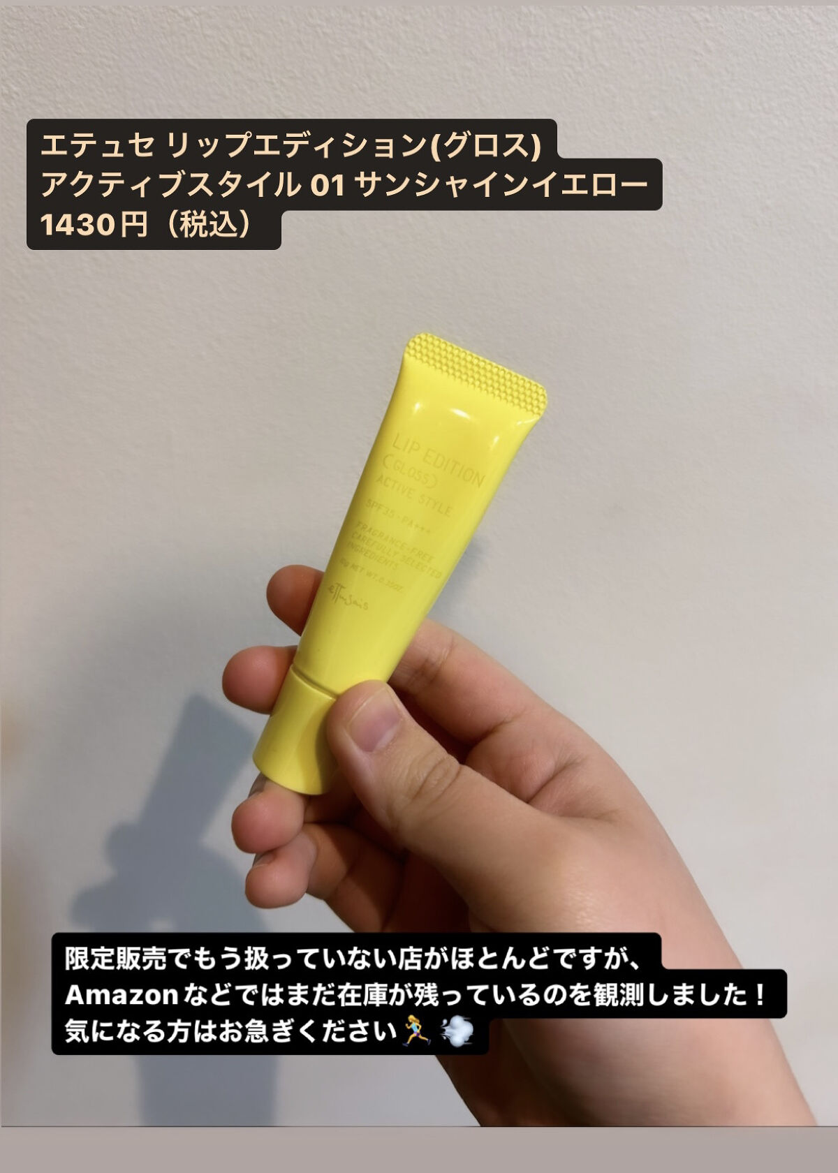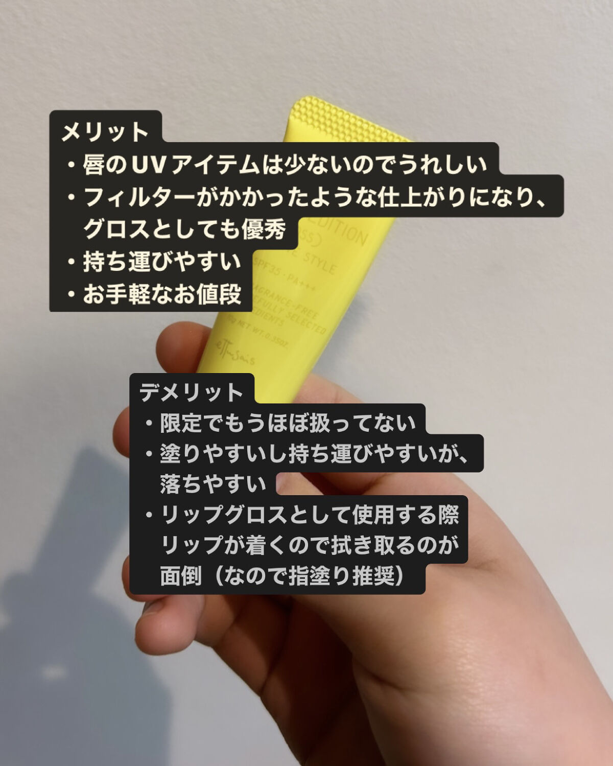 限定で発売されていたエテュセのリップエッセンス。口先が斜めにカットされており、そのまま唇に濡れるところがズボラ的にはありがたいところ。 少しピンクでこっくりしたテクスチャのエッセンスは唇をしっかり保湿してくれる感じがあって良いです◎ 私は夜寝る前に使ってたけどUVカット効果があるので、本当は昼間の下地とかに使うのが良いのかも!
