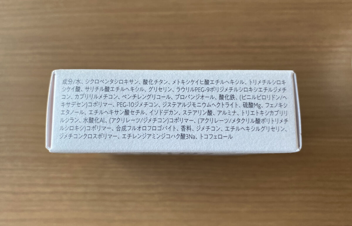 - <01 フェアライト> 水、シクロペンタシロキサン、酸化チタン、メトキシケイヒ酸エチルヘキシル、トリメチルシロキシケイ酸、サリチル酸エチルヘキシル、グリセリン、ラウリルPEG-9ポリジメチルシロキシエチルジメチコン、カプリリルメチコン、ペンチレングリコール、プロパンジオール、(ビニルピロリドン/ヘキサデセン)コポリマー、合成フルオロフロゴパイト、PEG-10ジメチコン、酸化鉄、ジステアルジモニウムヘクトライト、硫酸Mg、フェノキシエタノール、エチルヘキサン酸セチル、イソドデカン、ステアリン酸、アルミナ、水酸化Al、(アクリレーツ/ジメチコン)コポリマー、(アクリレーツ/メタクリル酸ポリトリメチルシロキシ)コポリマー、トリエトキシカプリリルシラン、香料、ジメチコン、エチルヘキシルグリセリン、ジメチコンクロスポリマー、エチレンジアミンジコハク酸3Na、トコフェロール <02 ライト> 水、シクロペンタシロキサン、酸化チタン、メトキシケイヒ酸エチルヘキシル、トリメチルシロキシケイ酸、サリチル酸エチルヘキシル、グリセリン、ラウリルPEG-9ポリジメチルシロキシエチルジメチコン、カプリリルメチコン、ペンチレングリコール、プロパンジオール、(ビニルピロリドン/ヘキサデセン)コポリマー、酸化鉄、PEG-10ジメチコン、合成フルオロフロゴパイト、ジステアルジモニウムヘクトライト、硫酸Mg、フェノキシエタノール、エチルヘキサン酸セチル、イソドデカン、ステアリン酸、アルミナ、水酸化Al、(アクリレーツ/ジメチコン)コポリマー、(アクリレーツ/メタクリル酸ポリトリメチルシロキシ)コポリマー、トリエトキシカプリリルシラン、香料、ジメチコン、エチルヘキシルグリセリン、ジメチコンクロスポリマー、エチレンジアミンジコハク酸3Na、トコフェロール <03 ミディアム> 水、シクロペンタシロキサン、酸化チタン、メトキシケイヒ酸エチルヘキシル、トリメチルシロキシケイ酸、サリチル酸エチルヘキシル、グリセリン、ラウリルPEG-9ポリジメチルシロキシエチルジメチコン、カプリリルメチコン、ペンチレングリコール、プロパンジオール、酸化鉄、(ビニルピロリドン/ヘキサデセン)コポリマー、PEG-10ジメチコン、ジステアルジモニウムヘクトライト、硫酸Mg、フェノキシエタノール、エチルヘキサン酸セチル、イソドデカン、ステアリン酸、アルミナ、トリエトキシカプリリルシラン、水酸化Al、(アクリレーツ/ジメチコン)コポリマー、(アクリレーツ/メタクリル酸ポリトリメチルシロキシ)コポリマー、合成フルオロフロゴパイト、香料、ジメチコン、エチルヘキシルグリセリン、ジメチコンクロスポリマー、エチレンジアミンジコハク酸3Na、トコフェロール