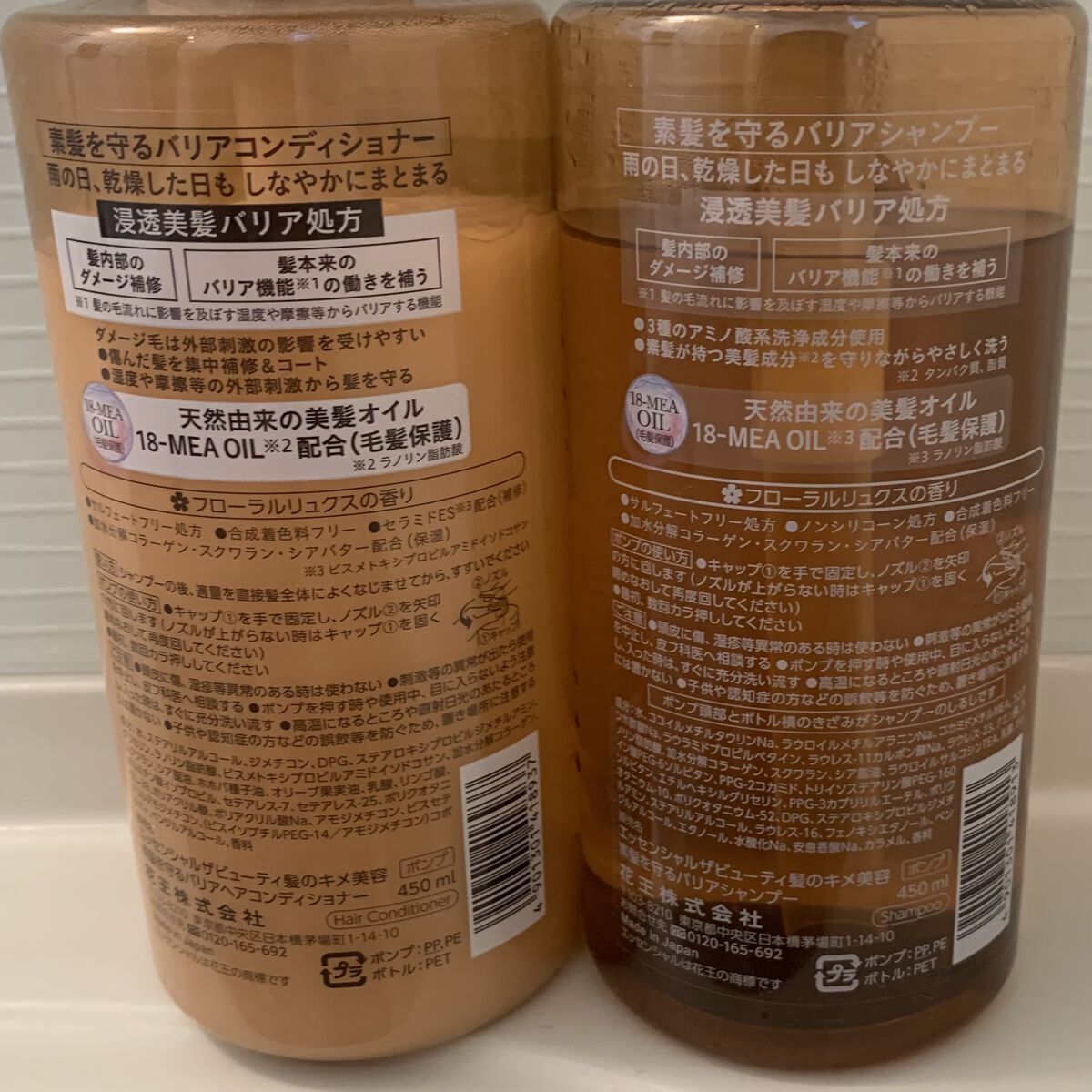 - うる髪続くバリアシャンプー・コンディショナー 雨の日、乾燥した日も しなやかにまとまる 【バリアシャンプー・コンディショナー共通】 ●浸透美髪バリア処方 ・髪内部のダメージ補修 ・ 髪本来のバリア機能*の働きを補う *髪の毛流れに変化を及ぼす湿度・摩擦等からバリアする機能 ●天然由来の美髪オイル 18-MEA OIL*配合(毛髪保護)*ラノリン脂肪酸 ●サルフェートフリー処方 ●合成着色料フリー ●加水分解コラーゲン・スクワラン・シアバター配合(保湿) ✿フローラルリュクスの香り 【バリアシャンプー】 ●3種のアミノ酸系洗浄成分使用 ●とろふわスフレ泡で素髪が持つ美髪成分*を守りながらやさしく洗う *タンパク質、脂質 ●ノンシリコーン処方 【バリアコンディショナー】 ●傷んだ髪を集中補修&コート ●湿度や摩擦等の外部刺激から髪を守る ●セラミドES*配合(補修)*ビスメトキシプロプルアミドイソドコサン