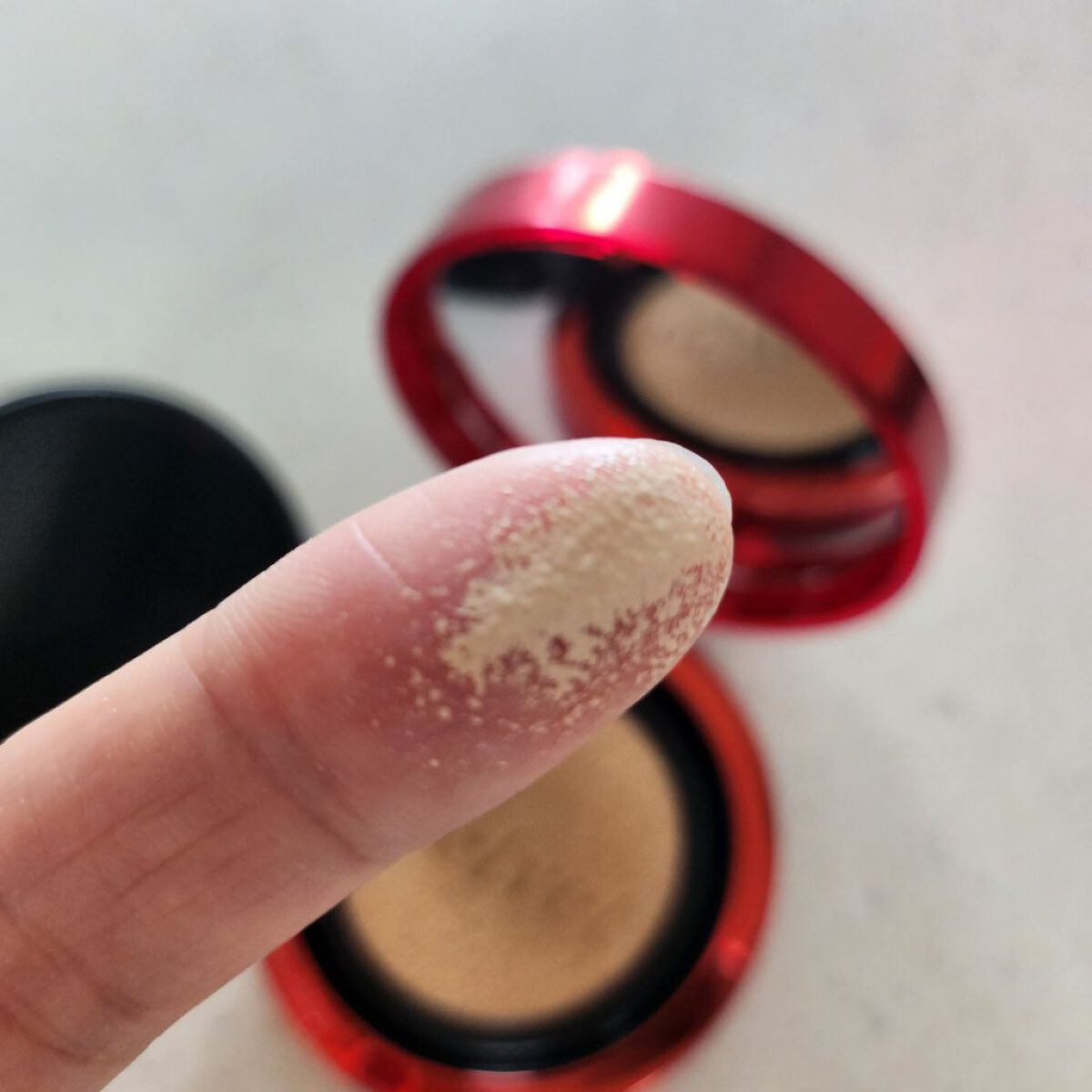 ハーフマットな仕上がりなので、アラフィフですが艶過ぎる不自然さなく、質感は自然な仕上がりです💕 基礎スキンケアでしっかり保湿してから塗ると、さらに密着感のあるプラス仕上がりです😌 ピンクトーンがプラスされたカラー感で、顔色を明るく(春っぽく)カバー後は上質の肌が演出できます🎵 毛穴カバー力もしっかりめです。 肌へしっかり付いて密着力はとても高いですので、化粧持ちがたいへん良いです。 他のクッションでしたら化粧直しするタイミングでも、まだまだ大丈夫です。(5時間くらいは余裕で持ちます)。 有名ブランドの製品より、相当いいなと感じました😊