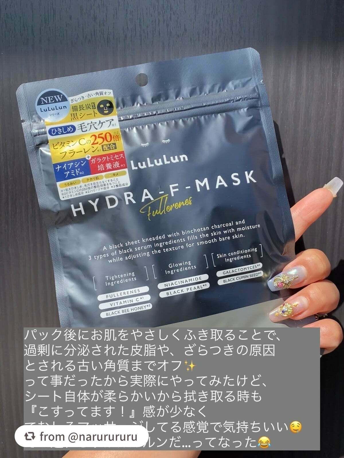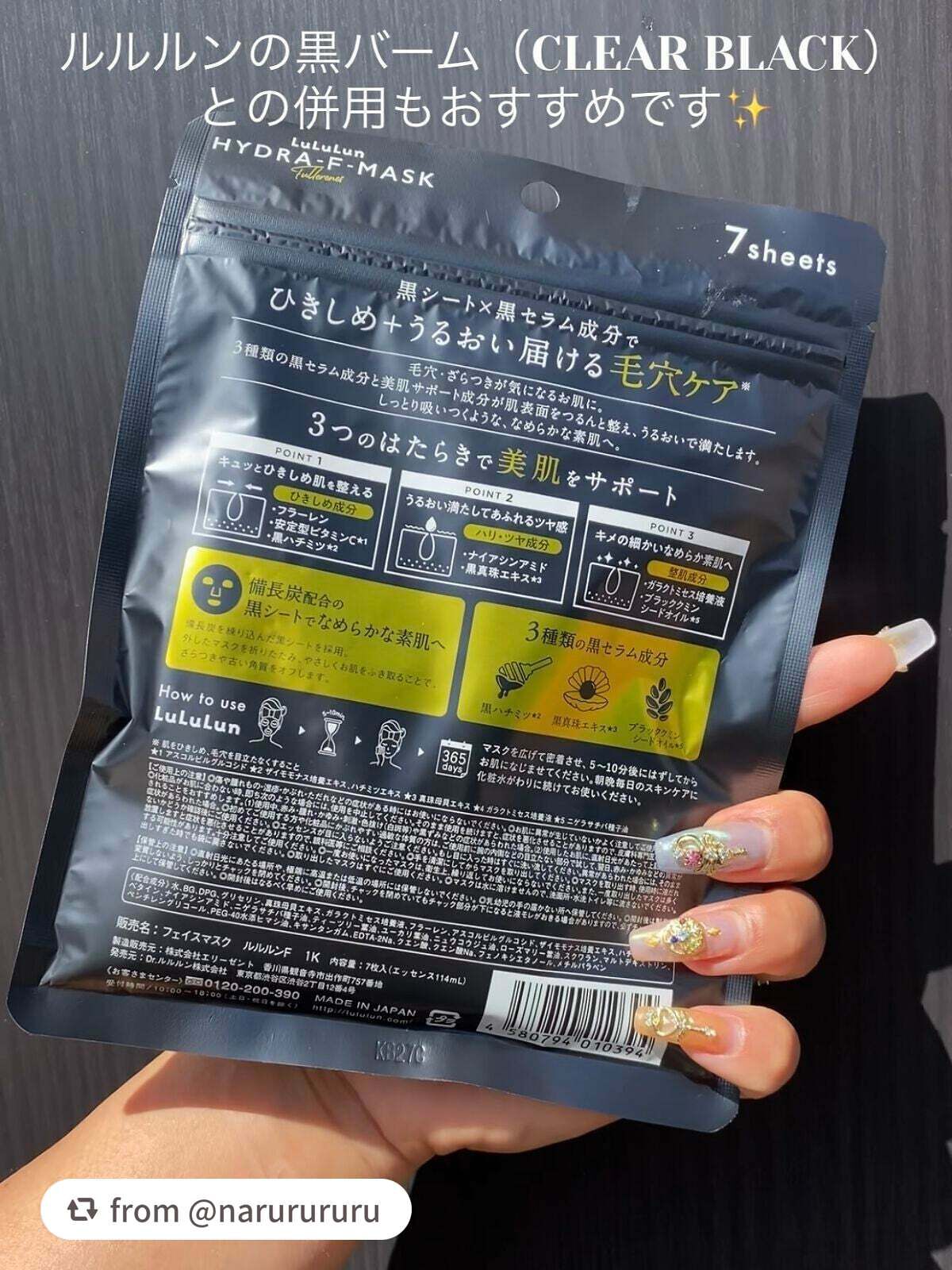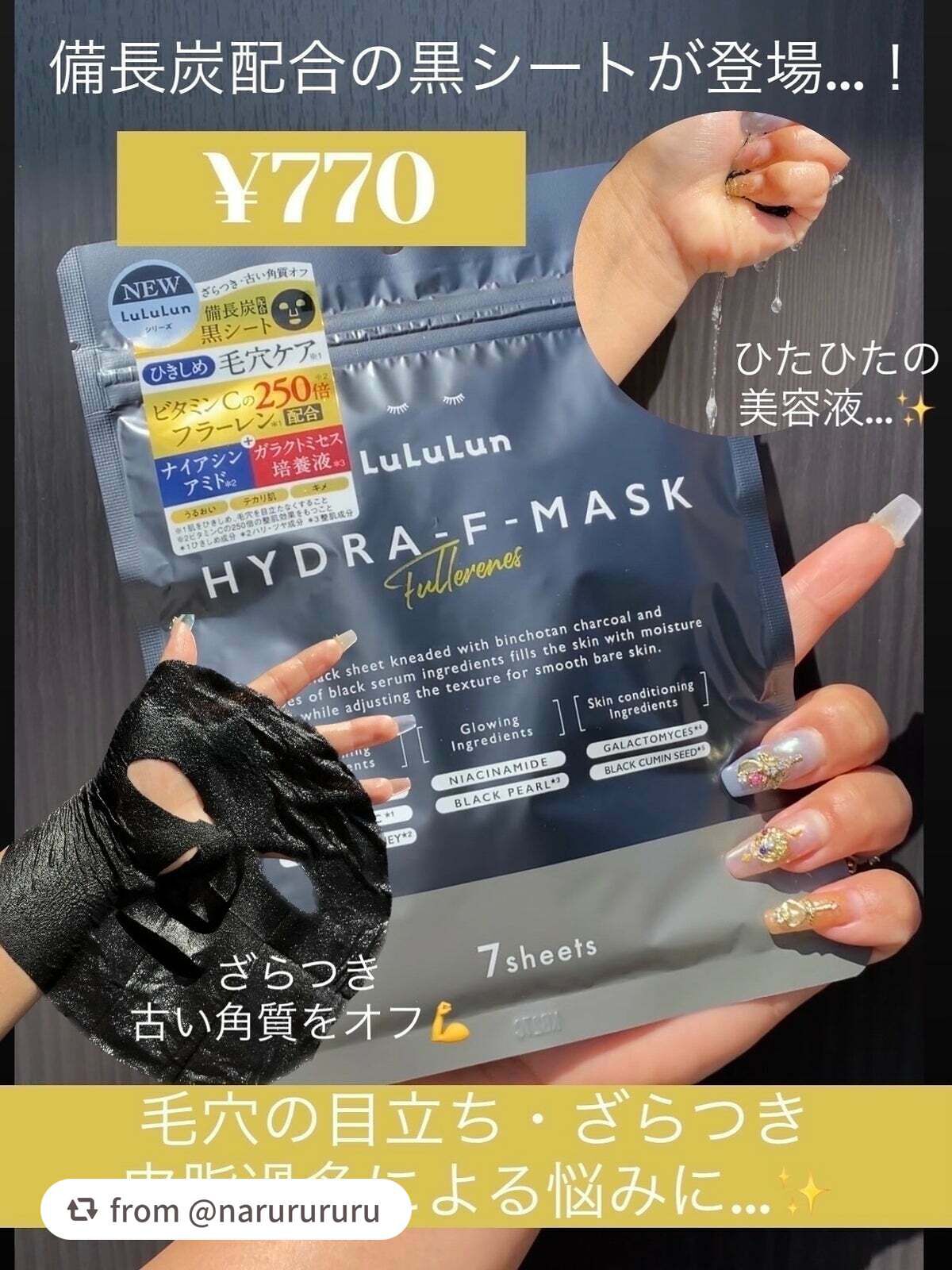 - ルルルンハイドラシリーズから新登場。 備長炭配合の黒シート×黒セラム成分でひきしめ+うるおい届ける毛穴ケア※。 毛穴・ざらつきが気になるお肌におすすめです。3種類の黒セラム美容液と美肌サポート成分がお肌の表面をつるんと整え、うるおいで満たします。 しっとり吸い付くような、なめらかな素肌へ。(※肌をひきしめ、毛穴を目立たなくすること)