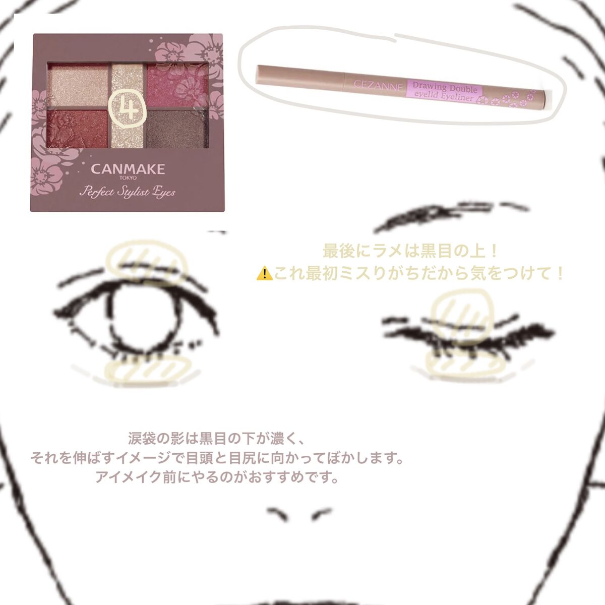【涙袋の描き方講座!!!】お久しぶりです!ちょっとサボってました(^^ ;今回は、前回の投稿(https://lipscosme.com/posts/5255398)からは少し離れて、涙袋の描き方を紹介します!(前回に続き、第2章でCLAYGEのシャンプートリートメントを紹介する予定でしたが、なかなかDianeのトリートメントが使い終わらなくて投稿が止まっておりますのでもう少々お待ちください💦)✼••┈┈••✼••┈┈••✼••┈┈••✼••┈┈••✼写真で詳しく書いたのでそちらをご覧ください!!おすすめとポイントは下に書いてあるので是非こちらも見てください!おすすめのダブルライナーは、、、・キャンメイク 3wayスリムシェードライナー01ナチュラルブラウン・キャンメイク3wayスリムアイルージュライナーピュアレッド・キャンメイク アイバッグコンシーラー02ピンクベージュです!3wayスリムシェードライナーは線が細く、他のダブルライナーと比べると1度で色が濃く出るので、少々ハードルは高いですが、クオリティは高いです!【ポイント!!】✨✨3wayスリムアイルージュライナーは色つきなので、影を茶