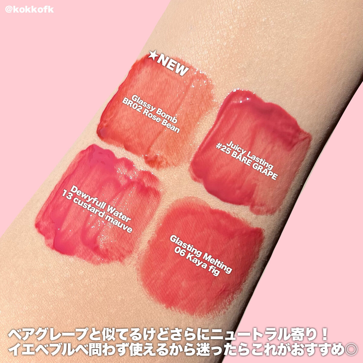 既存のジューシーラスティングティントよりさらに軽いツヤ感が魅力の新作ティント! 色選びの参考にしてね! やや黄みの明るいオレンジコーラル鮮やか得意なイエベ春におすすめ! 黄みの明るくまろやかなオレンジベージュ黄みが得意なイエベ春におすすめ! 青み黄み中間なくすみピンクベージュブルベ夏やイエベ春におすすめ 黄みの深くて鮮やかなオレンジレッド鮮やか得意なイエベ秋におすすめ! 青みの鮮やかで明るいビビッドピンク明るさ得意なブルベ冬やブルベ夏におすすめ! 青みの明るめで柔らかいローズピンクブルベ夏やブルベ冬におすすめ! 青み黄み中間な鮮やかで強いビビッドレッド2ndイエベ春のブルベ冬におすすめ! 青みの強い深くて鮮やかなベリーレッド2nd夏で鮮やか得意なブルベ冬におすすめ!