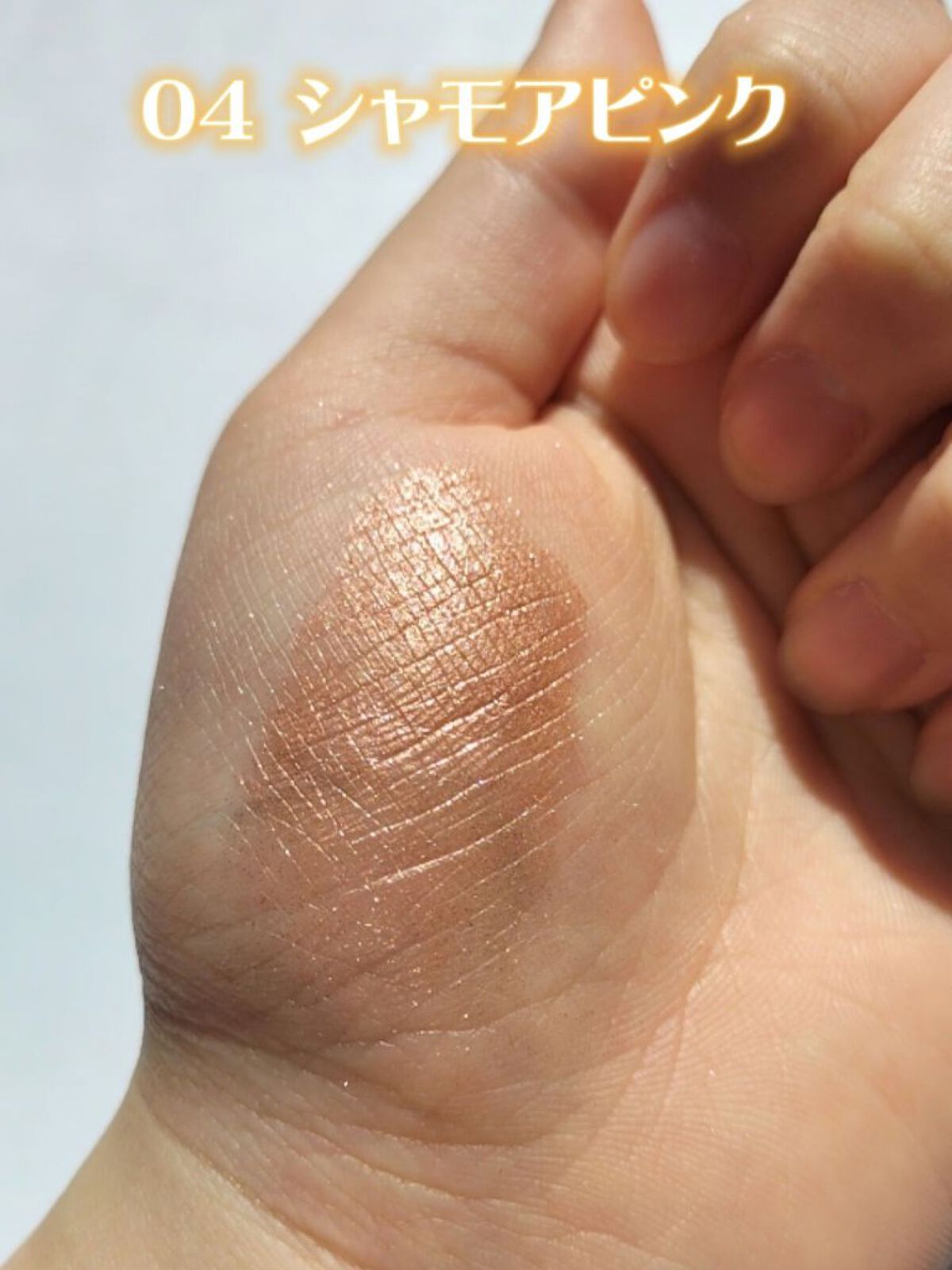 サーモンピンクのような色味のパレット。 柔らかい発色で、ベース、メイン、締め色、ラメが1色ずつ入っているパレットなので、とても使いやすくなっています。 ふんわりとした発色のチーク ラメが少し入っています。 ほんのりピンクのハイライト 血色感が出るので、チークとしても使えます。 もものようなピンク系のリップ とてもちゅるちゅるで、ティッシュオフしても色が残ります。