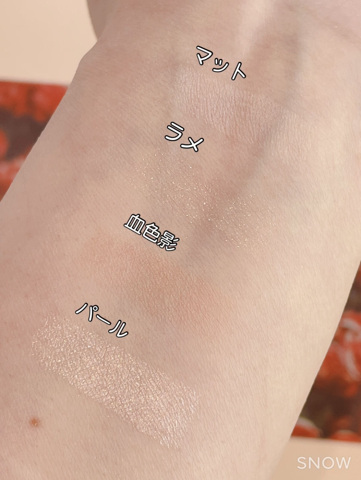 - マット・パール・ラメ入りで3パターンの涙袋が作れる 涙袋用アイシャドウパレット 涙袋用に3色、涙袋の影用に1色がセットされた涙袋用のアイシャドウパレットです。 その日の気分やTPOに合わせて選んでみてくださいね! マットは透け感があり目元のシワが気になりにくく、 パールは繊細で透明感のあるツヤっとした仕上がりに、 ラメはキラキラと輝く透け発色です。 涙袋の影用の「血色影カラー」は、影寄りの色なのに血色感もあって目元が暗くならない パウダーだからこそできた絶妙な色味なんです!