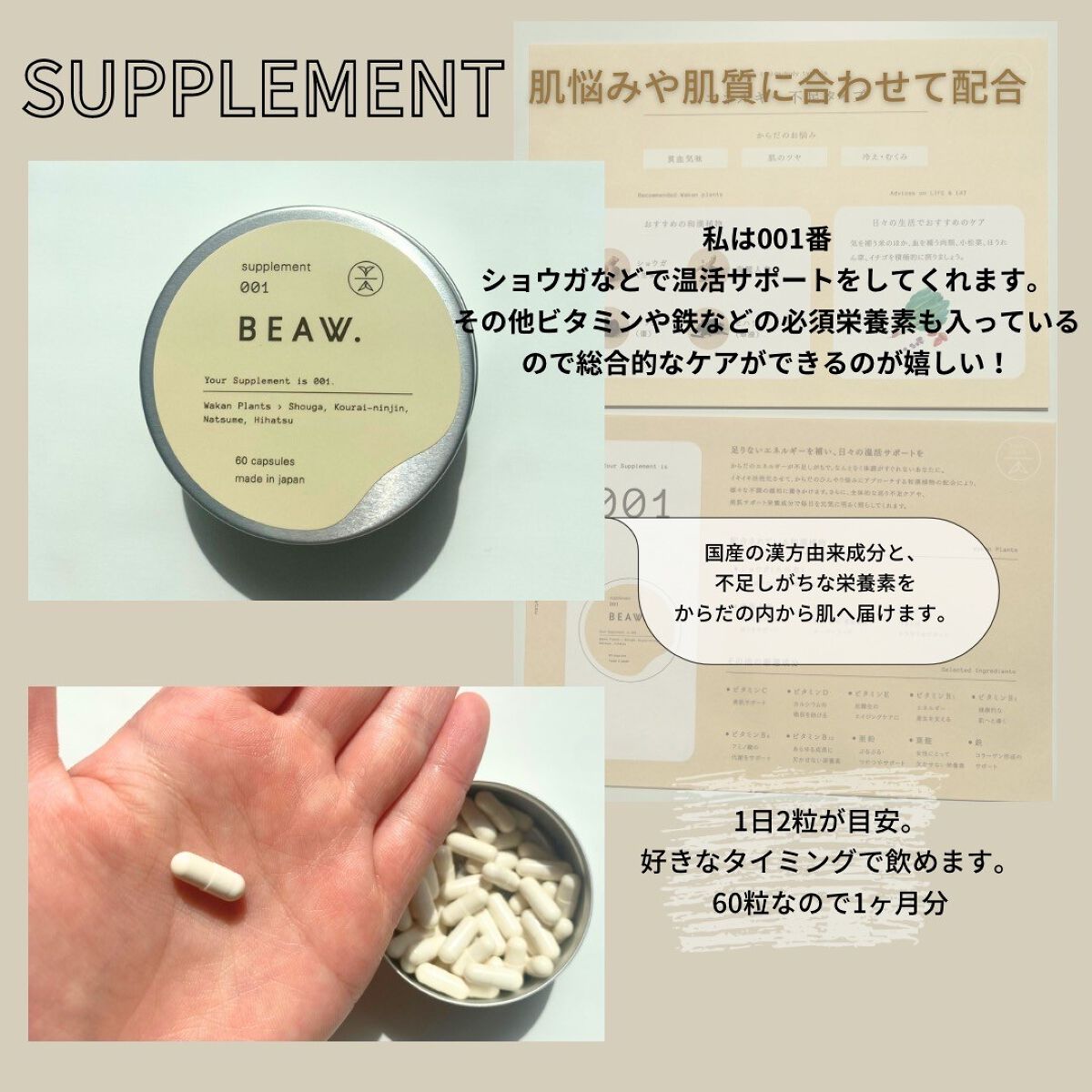 - ・BEAW.のパーソナライズケアは始めにパーソナライズ診断を行い、20種類の和漢と、自然由来の保湿成分の組み合わせから、一人ひとりに合わせた製品をお届けします。 ・現在の自分の悩みにぴったりのパーソナルケアキット、和漢植物由来成分を配合した2剤式のセラムとサプリメントのセットでお届けします。からだの内と外から同時に理想の美しさをめざせるデュアルケアで、あなたの美容をサポートします。 ・美容液は、肌荒れ予防、乾燥、毛穴、テカリ、くすみ*、年齢肌、ツヤ肌、などその人それぞれの悩みに対して適した処方で国産和漢植物成分と、植物エキス、ビタミンやセラミド、プラセンタ、ナイアシンアミド、などを配合した保湿成分を分析結果に合わせて配合。*乾燥による ・サプリメントは体の内側からキレイをサポートする国産和漢植物成分と20種類以上のビタミン、ミネラルをそれぞれに合わせて配合。 -対象商品- BEAW.リッチセラム003、008、015 BEAW.サプリメント:001、007、031 BEAW.フェイスウォッシュ:019、026、045 -内容量- BEAW.リッチセラム:30ml BEAW.サプリメント:60粒 BEAW.フェイスウォッシュ:80g