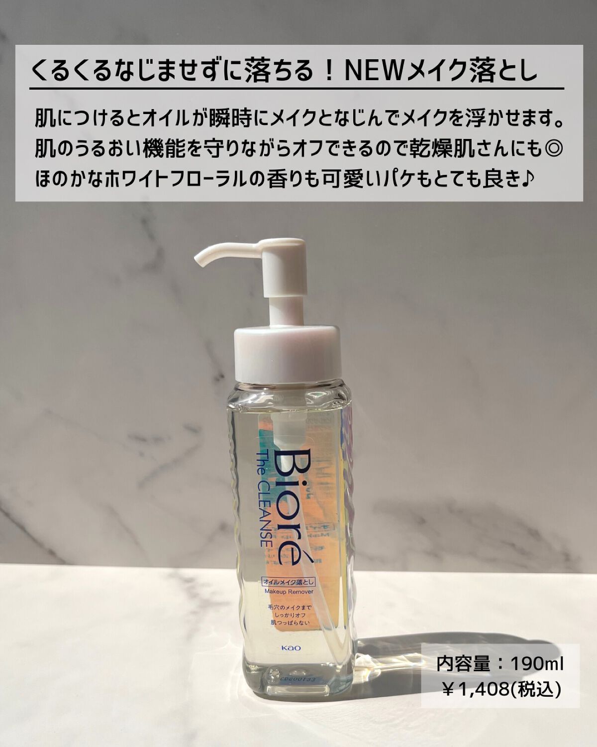 - つけるだけメイク瞬浮き、くるくるなじませずに落ちる! ウォータープルーフマスカラ・毛穴のメイクまでしっかりオフするのに、肌つっぱりにくい。 【カサつきがちなデリケート肌にも使える】 ・肌になじませるときの摩擦を最小限*1に抑えた設計 ・肌の潤いを保つバリア機能を守って洗えます。 【ストレス低減設計】 ・なじませる手間なしで時短になる ・まさつレスな洗い心地 ・つめかえやすい広口ボトル ●まつ毛エクステをしていても使えます。*2 ●ほのかなホワイトフローラルの香り *1ビオレメイク落としシリーズ内比較 *2シアノアクリレート系のグルーを使用したまつ毛エクステンションにお使いいただけます。