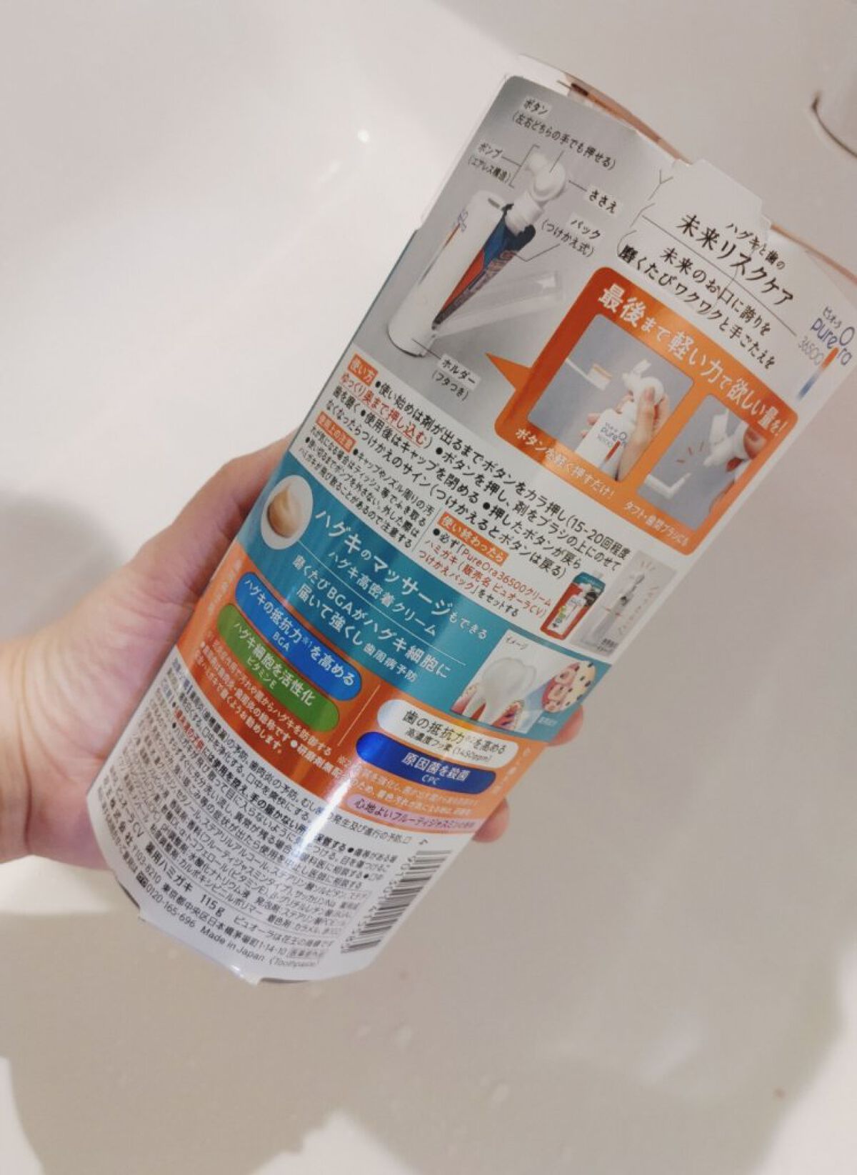 - 【医薬部外品】 ハグキと歯の未来リスクケア ハグキのマッサージもできる高密着クリームが抗炎症成分BGA(β-グリチルレチン酸)をハグキ細胞に届け、磨くたび歯周病(歯肉炎・歯周炎)予防。 ビタミンE(酢酸DL-α-トコフェロール)がハグキ細胞を活性化して歯周病予防。 歯質強化成分の高濃度フッ素<1450ppm>が菌の出す酸から歯を防御して、むし歯予防。 殺菌成分CPC(塩化セチルピリジニウム)が原因菌を殺菌し、むし歯・口臭予防。 最後まで軽い力で欲しい量を出せるポンプで、タフト・歯間ブラシにも剤を付けやすい。 使い終わったら、パックをつけかえるサステナブルな仕様。 心地よいフルーティジャスミンの香味。 *6歳未満の子供には使用を控え、手の届かない所に保管する <つけかえ用 115g> ホルダーにセットしてポンプをつけて使用する、サステナブルなつけかえパック。