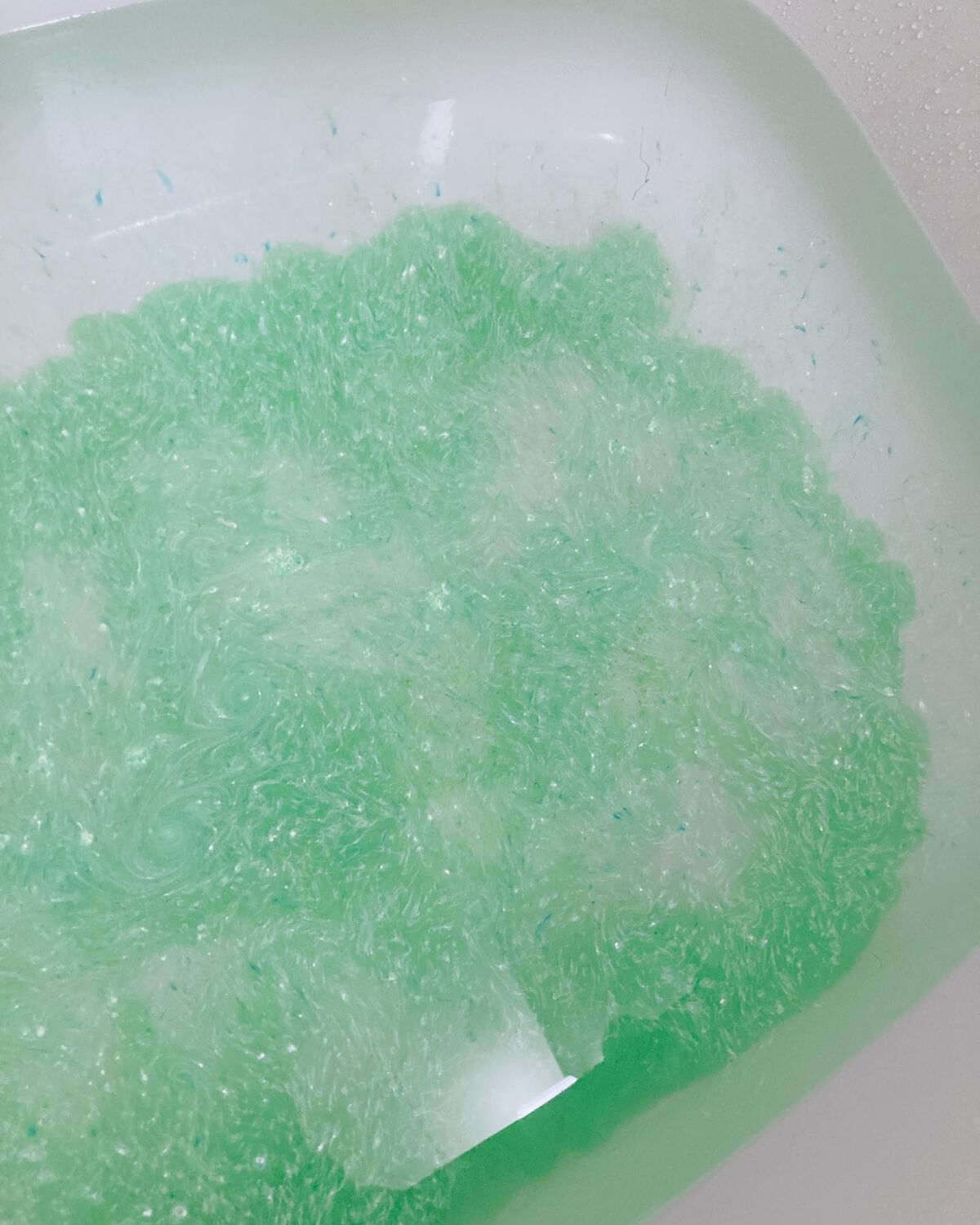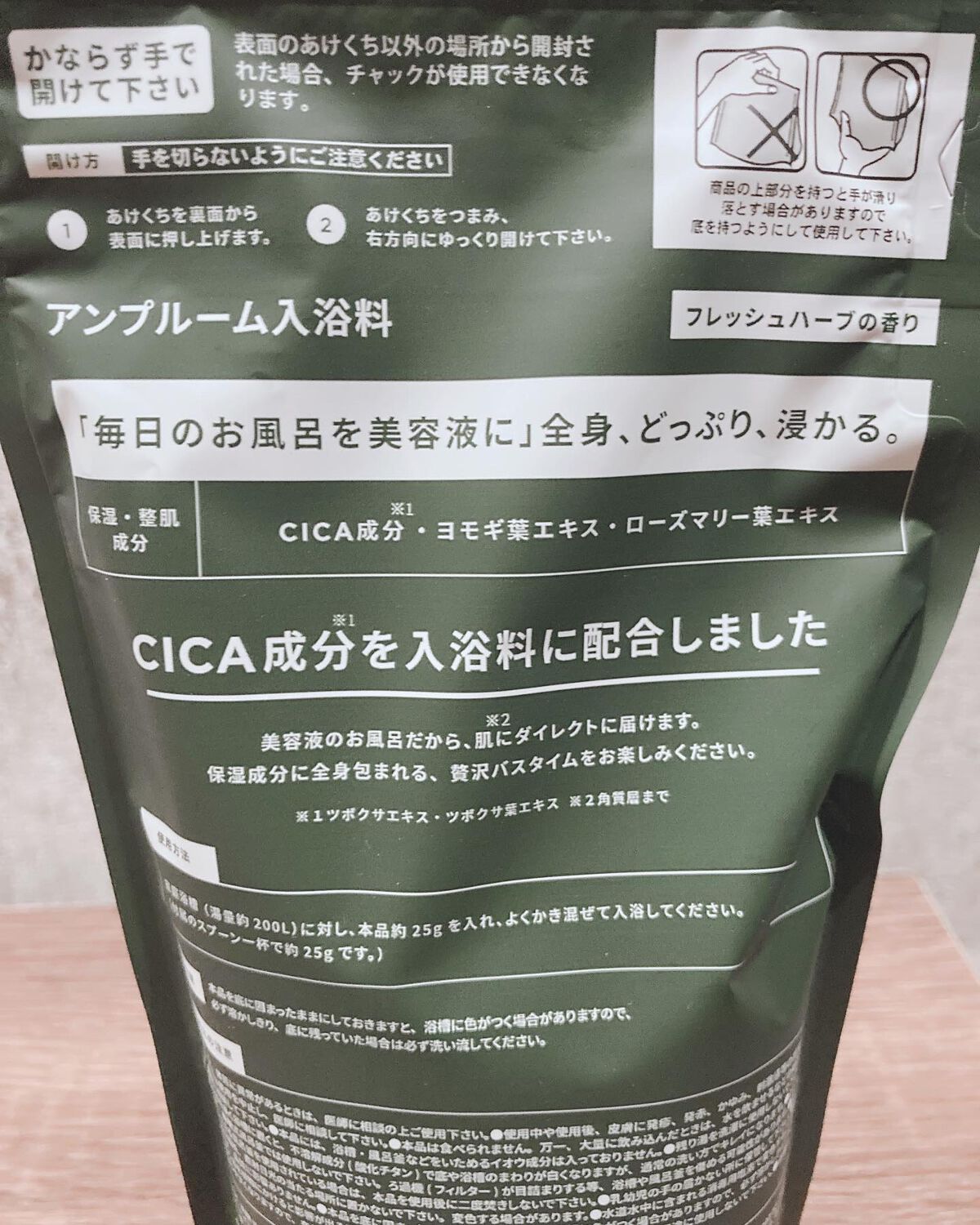 CICA成分配合入浴料 お湯がまろやかに感じて良かったです♨️ CICA成分(ツボクサエキス、ツボクサ葉エキス)が肌荒れを防ぎ、普段ケアの難しい背中までしっかりケア。 フレッシュハーブの香りでお湯の色はミルキーグリーン💚