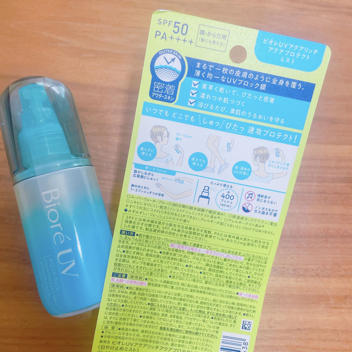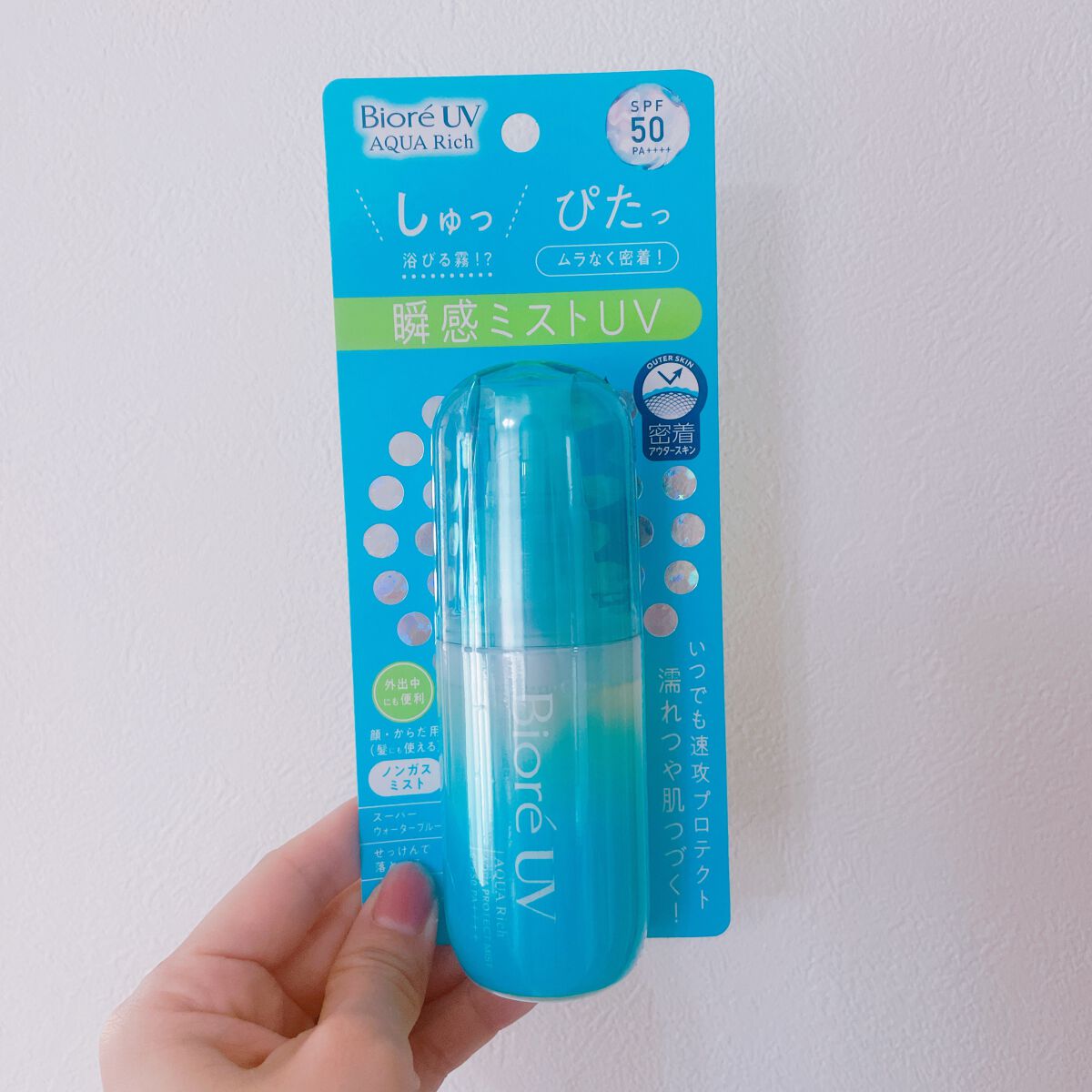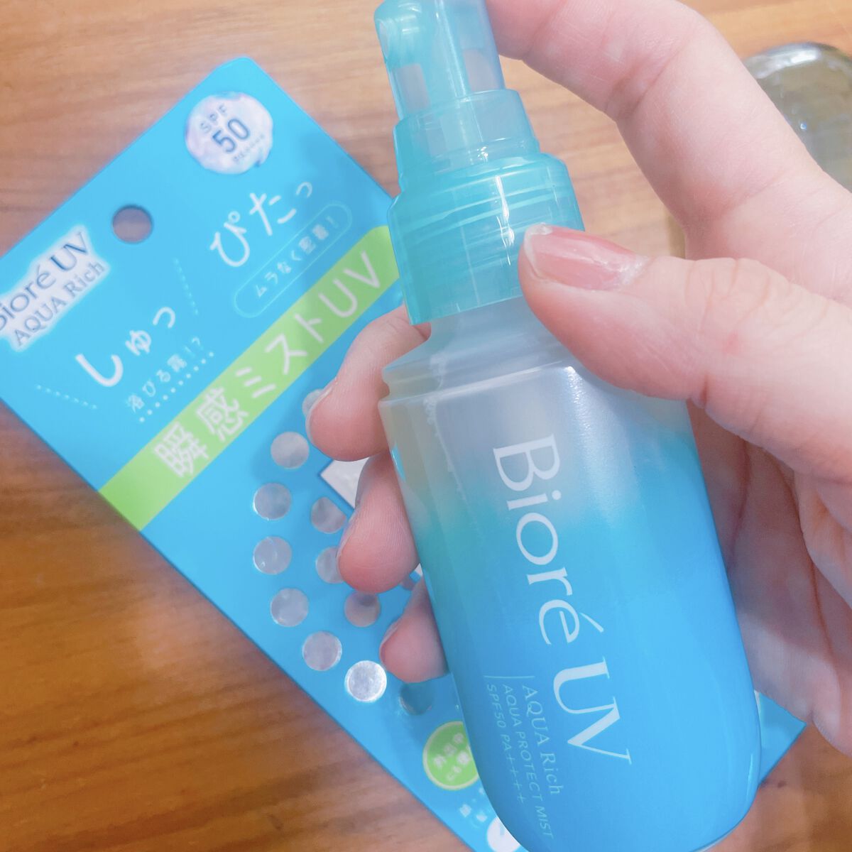 ビオレUVアクアリッチアクアプロテクトミストミストタイプの日焼け止め☀️髪にも使えるし、首や膝裏など塗りにくいところにも使いやすいです♪外出先での塗り直しにも便利!ガスタイプのスプレー缶だと、夏場に暑い中持ち歩くのも怖いし、公共のお手洗いで使...