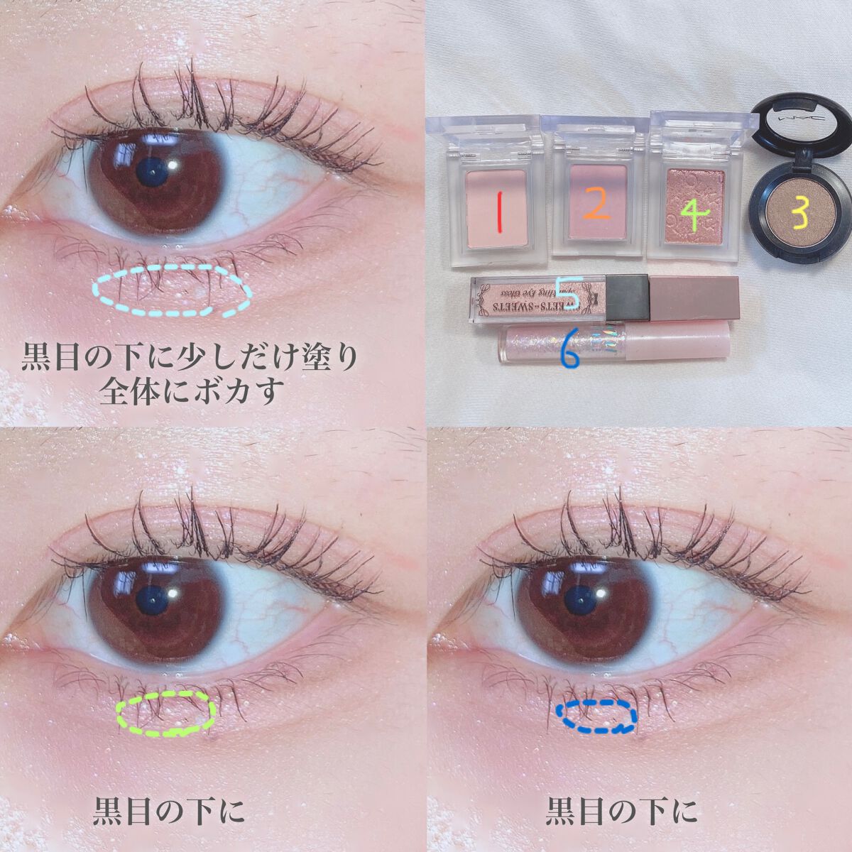 メインのピンクカラーは腫れぼったく見えないように上瞼の外側から三角ゾーンと涙袋の影を作るように塗りました! ラメはピンク系の色にすることでアイシャドウの色と合うようにしました😍 アイラインは少しだけ跳ね上げ風にすると甘すぎない印象で可愛いです💕