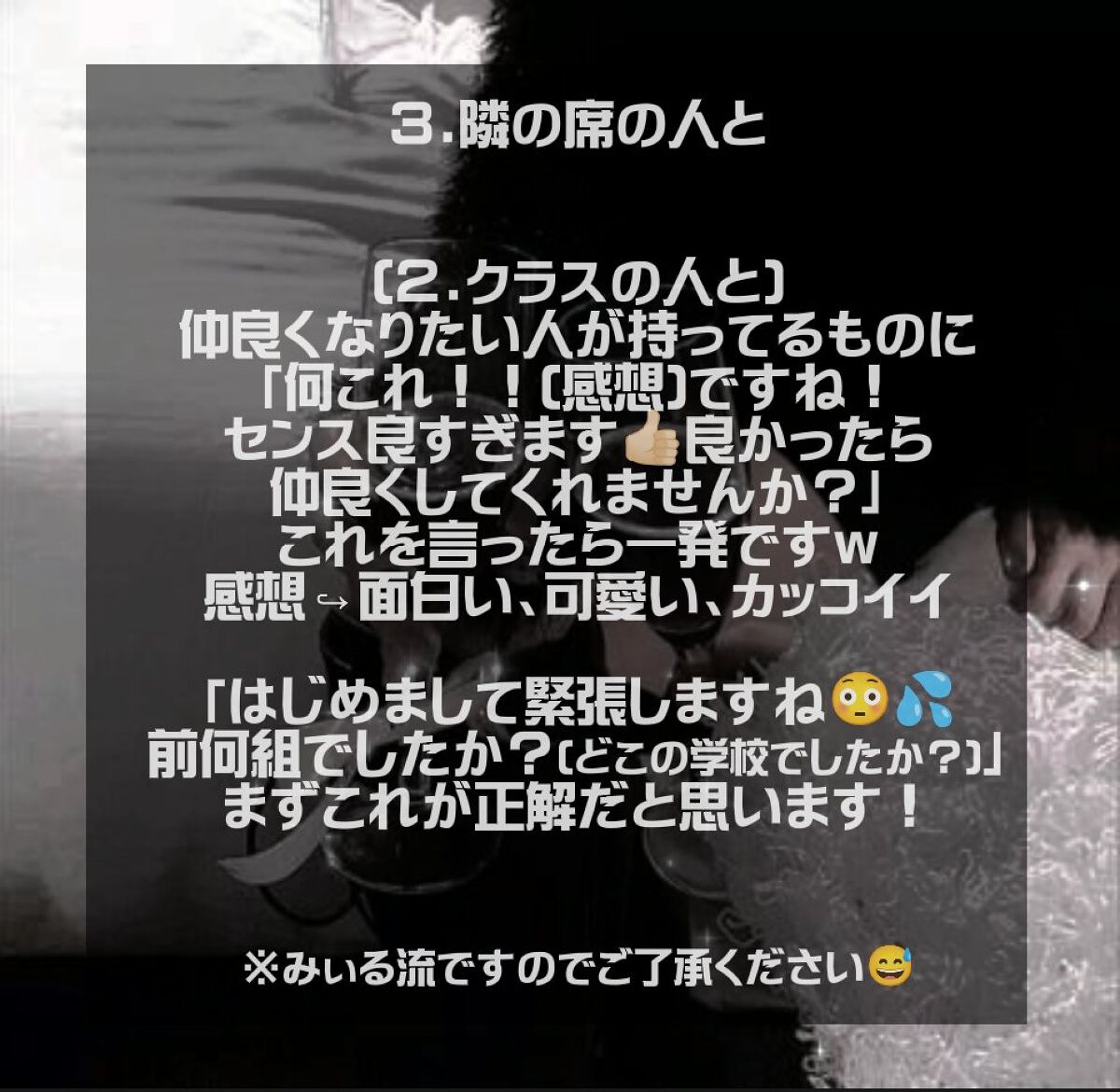 最初に⤵︎ ︎あくまでどこかで参考にしたみぃる流なので上手くいくかは分かりません 😅 自己紹介の時 最後に「みんなと話せるように 頑張るので話しかけた時は 応えてください!!」と言ったら「良かったら話しかけてください!!」と言った時よりも話しかけてもらいやすくなります(?) 隣の席の子と (2.クラスの子と) 仲良くなりたい子の持ってる物に対して「何これ!!めっちゃ(感想)ですね! センス良すぎます 👍🏻 良かったら 仲良くしてください??」これを言ったらほぼ一発ですw