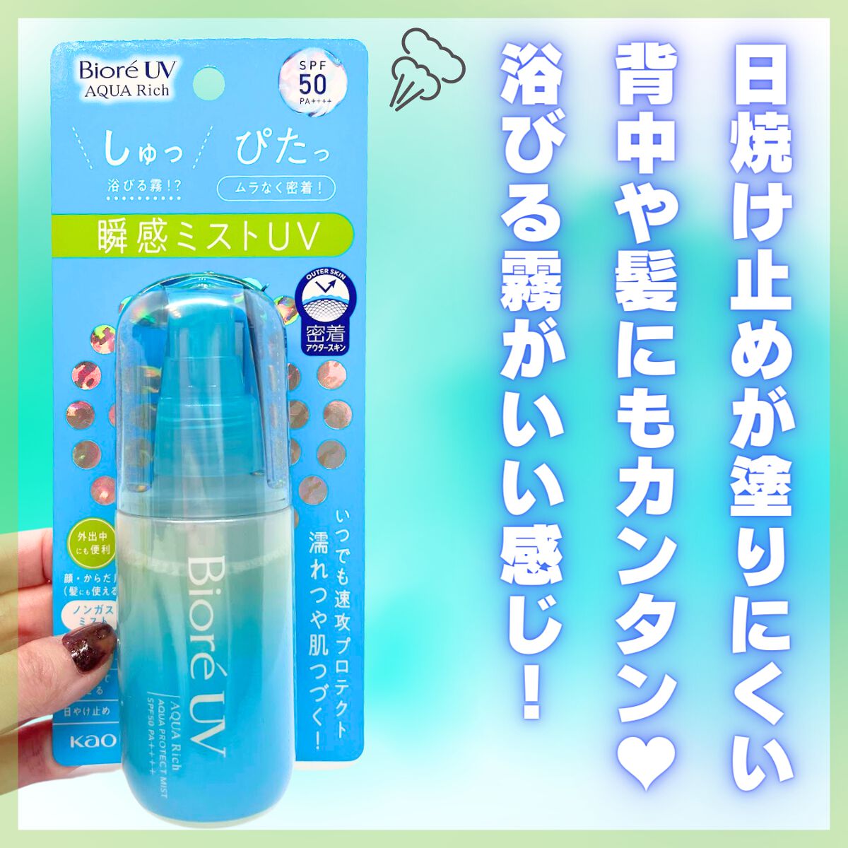- 「しゅっ」→「ぴたっ」浴びる霧!?からのムラなく密着!いつでもどこでも速攻プロテクトで濡れつや肌続く!瞬感ミストUV。SPF50 PA++++、スーパーウォータープルーフ(80分間の耐水試験で確認済み)。顔・からだ用日やけ止め(髪にも使える)。素早くなじんで、白浮きしない。浴びるたび素肌のうるおい守る。スクワラン配合(保湿成分)。せっけんで落とせる。