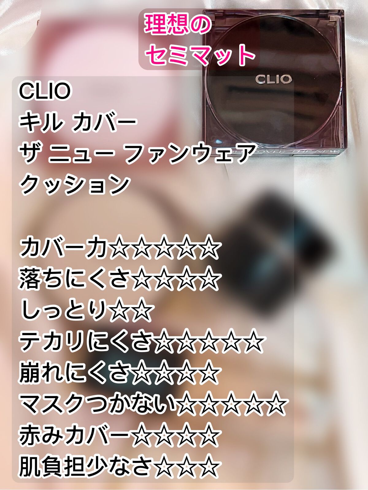 CLIOキルカバーファンウェアクッションザオリジナル21CLINGERIE崩れにくさ:★★★★密着度:★★★テカリ:★★★持続力:★★★という感じかな??セミマットな感じの印象で、乾燥肌から普通肌にいい感じな気がする!付属のパフより、ロージー...