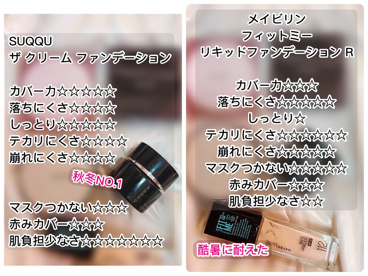 カバー力あり 崩れにくさも普通の気温なら大丈夫だろうけど日本の夏には勝てなかった 肌荒れしないのは🙆🏻♀️⭕️ 時間経つと目の下や口周りの乾燥はちょっと出る しっかり塗ってる感が出るタイプなのできちんとしたいシーンに⭕️ 使いやすいファンデーション マスクつかなさが凄い⭕️ ニキビ出来ないのも⭕️ カバー力そこそこ 持ちよし 崩れ方綺麗 連日使用したらアラフォーの目の下がシワシワしてきたので同年代の方は注意😂 20代までの乾燥肌以外の方には超~おすすめ✨✨ 肌負担が3つの中で1番軽い⭕️ 肌が疲れない⭕️ 乾燥しない⭕️ お直しに使っても綺麗~✨✨ マスクにはまぁまぁつく マスクさえ無ければもちは良い 皮脂崩れに弱く乾燥崩れには強い ナチュラルめに仕上がるのでアラフォーは若見え肌になる🙆🏻♀️⭕️✨ お直し用のファンデーションとしてレギュラー入り✨