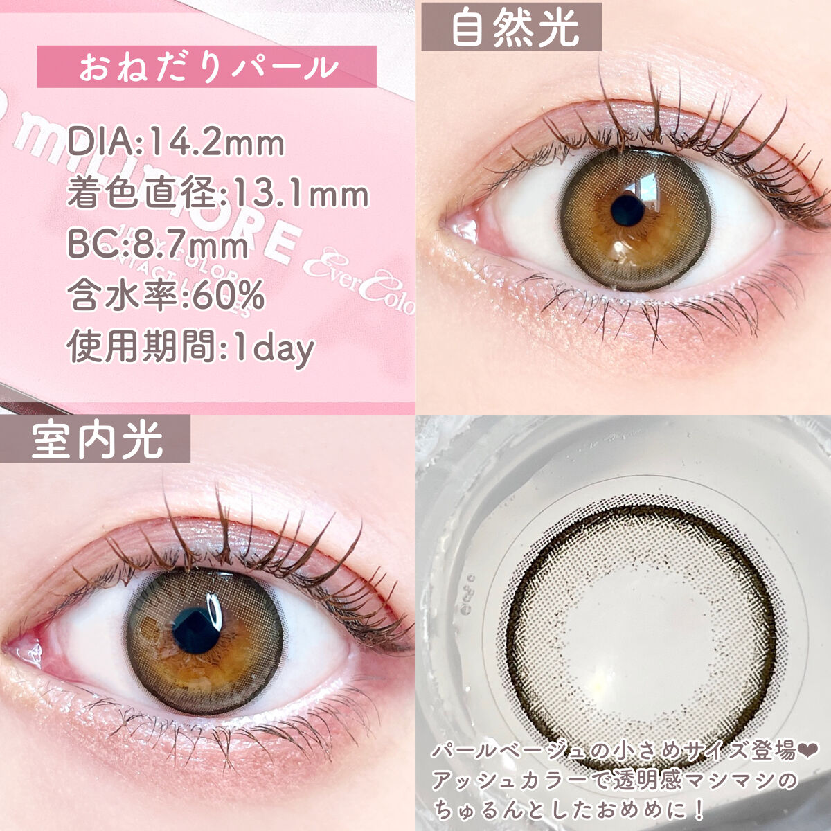 EverColor1dayカラコンの大人気カラー比較💕⚪️エバーカラーナチュラル パールベージュ⚪️エバーカラーミリモアおねだりパールカラコンスペック ↓⚪️パールベージュDIA:14.5mmBC:8.7mm着色直径:13.8mm含水率:...