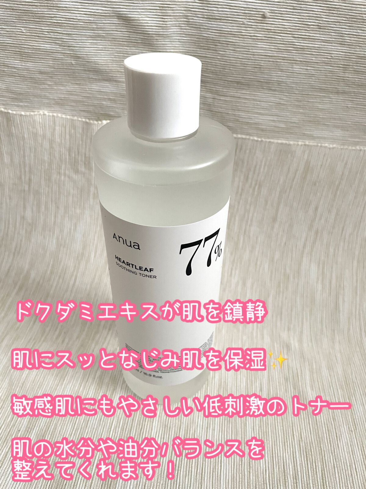 韓国のスキンケアブランドAnua✨️ この、Anuaドクダミ77 スージングトナーは、ドクダミエキスを77%含有しているトナーで、ドクダミは、抗炎症作用や鎮静効果があり、敏感肌やトラブル肌のケアに適しています!!! 本当に鎮静効果が強い。肌が落ち着いてくれる! 肌の鎮静・冷却効果、炎症を抑えてくれる効果があるから、紫外線の時期にも助かるし、水分補給・保湿効果もじゅうぶんだから、乾燥する季節にもぴったり! 特に敏感肌や肌荒れ、ニキビが気になる方におすすめのトナーです。