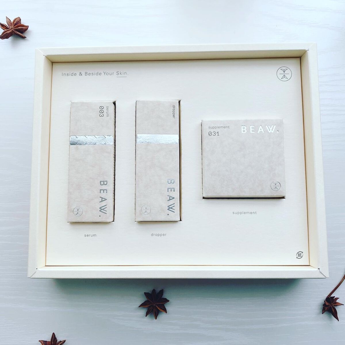 - ・BEAW.のパーソナライズケアは始めにパーソナライズ診断を行い、20種類の和漢と、自然由来の保湿成分の組み合わせから、一人ひとりに合わせた製品をお届けします。 ・現在の自分の悩みにぴったりのパーソナルケアキット、和漢植物由来成分を配合した2剤式のセラムとサプリメントのセットでお届けします。からだの内と外から同時に理想の美しさをめざせるデュアルケアで、あなたの美容をサポートします。 ・美容液は、肌荒れ予防、乾燥、毛穴、テカリ、くすみ*、年齢肌、ツヤ肌、などその人それぞれの悩みに対して適した処方で国産和漢植物成分と、植物エキス、ビタミンやセラミド、プラセンタ、ナイアシンアミド、などを配合した保湿成分を分析結果に合わせて配合。*乾燥による ・サプリメントは体の内側からキレイをサポートする国産和漢植物成分と20種類以上のビタミン、ミネラルをそれぞれに合わせて配合。 -対象商品- BEAW.リッチセラム003、008、015 BEAW.サプリメント:001、007、031 BEAW.フェイスウォッシュ:019、026、045 -内容量- BEAW.リッチセラム:30ml BEAW.サプリメント:60粒 BEAW.フェイスウォッシュ:80g