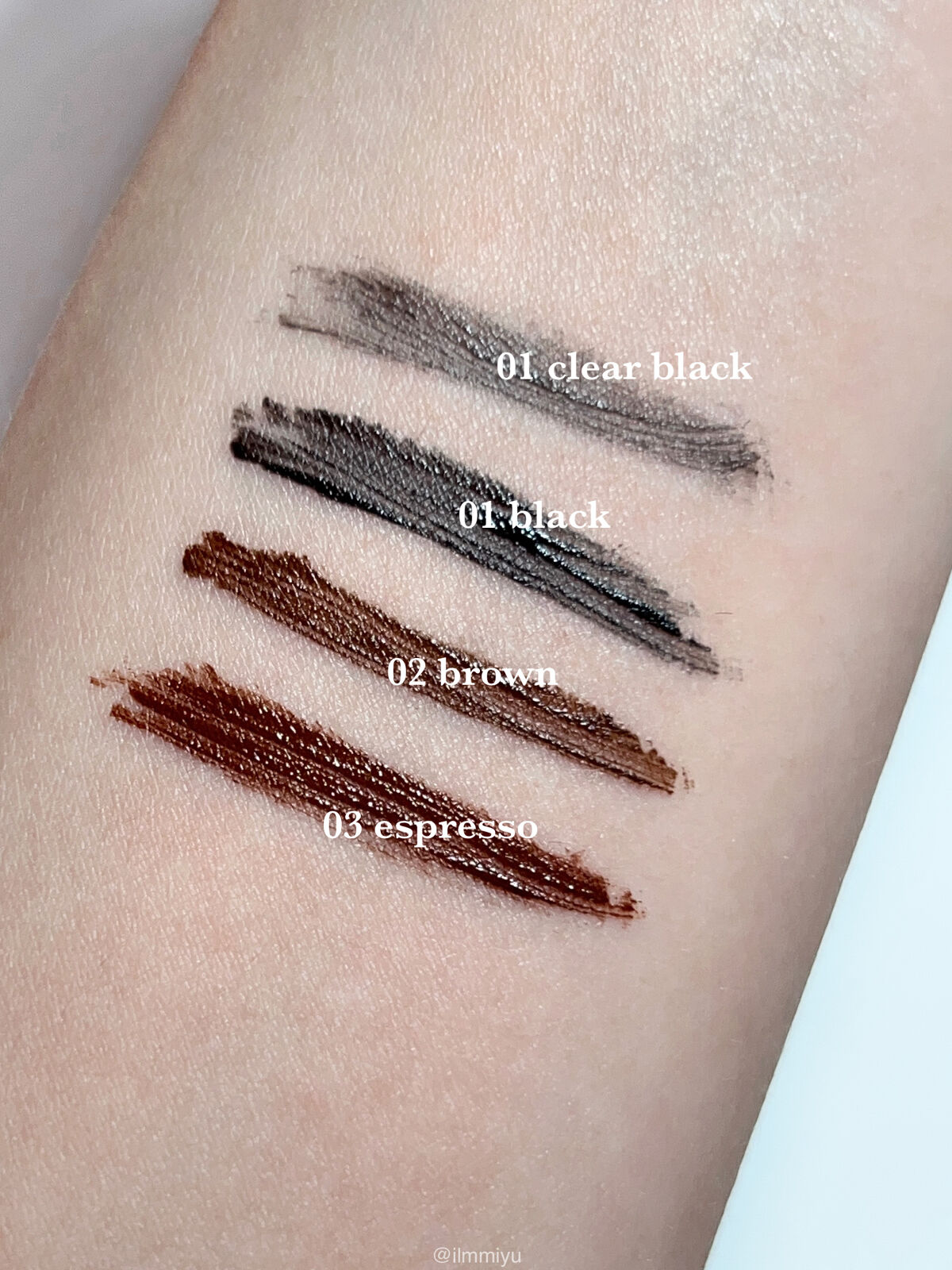 - <01 ブラック> イソドデカン、トリメチルシロキシケイ酸、セレシン、ジステアルジモニウムヘクトライト、マイクロクリスタリンワックス、ポリプロピルシルセスキオキサン、酸化鉄、タルク、(パルミチン酸/エチルヘキサン酸)デキストリン、ベヘネス-30、炭酸プロピレン、シリカ、パルミチン酸デキストリン、テトラ(ヒドロキシステアリン酸/イソステアリン酸)ジペンタエリスリチル、水添ポリイソブテン、カプリル酸グリセリル、トリエトキシカプリリルシラン、ビオチン、ヒアルロン酸ヒドロキシプロピルトリモニウム、水、BG、グリシン、セリン、グルタミン酸、アスパラギン酸、ロイシン、アラニン、リシン、アルギニン、チロシン、フェニルアラニン、バリン、プロリン、トレオニン、イソロイシン、ヒスチジン、メチオニン、システイン <02 ブラウン> イソドデカン、トリメチルシロキシケイ酸、セレシン、ジステアルジモニウムヘクトライト、マイクロクリスタリンワックス、ポリプロピルシルセスキオキサン、酸化鉄、タルク、(パルミチン酸/エチルヘキサン酸)デキストリン、ベヘネス-30、炭酸プロピレン、シリカ、パルミチン酸デキストリン、テトラ(ヒドロキシステアリン酸/イソステアリン酸)ジペンタエリスリチル、水添ポリイソブテン、グンジョウ、カプリル酸グリセリル、トリエトキシカプリリルシラン、ビオチン、ヒアルロン酸ヒドロキシプロピルトリモニウム、水、BG、グリシン、セリン、グルタミン酸、アスパラギン酸、ロイシン、アラニン、リシン、アルギニン、チロシン、フェニルアラニン、プロリン、バリン、トレオニン、イソロイシン、ヒスチジン、システイン、メチオニン <06 ディープハーブ> イソドデカン、トリメチルシロキシケイ酸、セレシン、ジステアルジモニウムヘクトライト、マイクロクリスタリンワックス、ポリメチルシルセスキオキサン、酸化鉄、タルク、(パルミチン酸/エチルヘキサン酸)デキストリン、ベヘネス-30、炭酸プロピレン、シリカ、酸化クロム、パルミチン酸デキストリン、水添ポリイソブテン、テトラ(ヒドロキシステアリン酸/イソステアリン酸)ジペンタエリスリチル、グンジョウ、酸化チタン、カプリル酸グリセリル、トリエトキシカプリリルシラン、水酸化Al、ヒアルロン酸ヒドロキシプロピルトリモニウム、ビオチン、水、BG、グリシン、セリン、グルタミン酸、アスパラギン酸、ロイシン、アラニン、リシン、アルギニン、チロシン、フェニルアラニン、プロリン、バリン、トレオニン、イソロイシン、ヒスチジン、システイン、メチオニン <07 ディープローズ> イソドデカン、トリメチルシロキシケイ酸、セレシン、ジステアルジモニウムヘクトライト、マイクロクリスタリンワックス、ポリメチルシルセスキオキサン、タルク、(パルミチン酸/エチルヘキサン酸)デキストリン、ベヘネス-30、グンジョウ、炭酸プロピレン、水酸化Al、シリカ、酸化チタン、赤226、パルミチン酸デキストリン、酸化鉄、水添ポリイソブテン、テトラ(ヒドロキシステアリン酸/イソステアリン酸)ジペンタエリスリチル、カプリル酸グリセリル、トリエトキシカプリリルシラン、ヒアルロン酸ヒドロキシプロピルトリモニウム、ビオチン、水、BG、グリシン、セリン、グルタミン酸、アスパラギン酸、ロイシン、アラニン、リシン、アルギニン、チロシン、フェニルアラニン、プロリン、バリン、トレオニン、イソロイシン、ヒスチジン、システイン、メチオニン <08 モハーベピンク> イソドデカン、トリメチルシロキシケイ酸、セレシン、ジステアルジモニウムヘクトライト、マイクロクリスタリンワックス、ポリメチルシルセスキオキサン、タルク、(パルミチン酸/エチルヘキサン酸)デキストリン、ベヘネス-30、酸化チタン、酸化鉄、炭酸プロピレン、シリカ、パルミチン酸デキストリン、水酸化Al、水添ポリイソブテン、テトラ(ヒドロキシステアリン酸/イソステアリン酸)ジペンタエリスリチル、赤226、グンジョウ、カプリル酸グリセリル、トリエトキシカプリリルシラン、ヒアルロン酸ヒドロキシプロピルトリモニウム、ビオチン、水、BG、グリシン、セリン、グルタミン酸、アスパラギン酸、ロイシン、アラニン、リシン、アルギニン、チロシン、フェニルアラニン、プロリン、バリン、トレオニン、イソロイシン、ヒスチジン、システイン、メチオニン