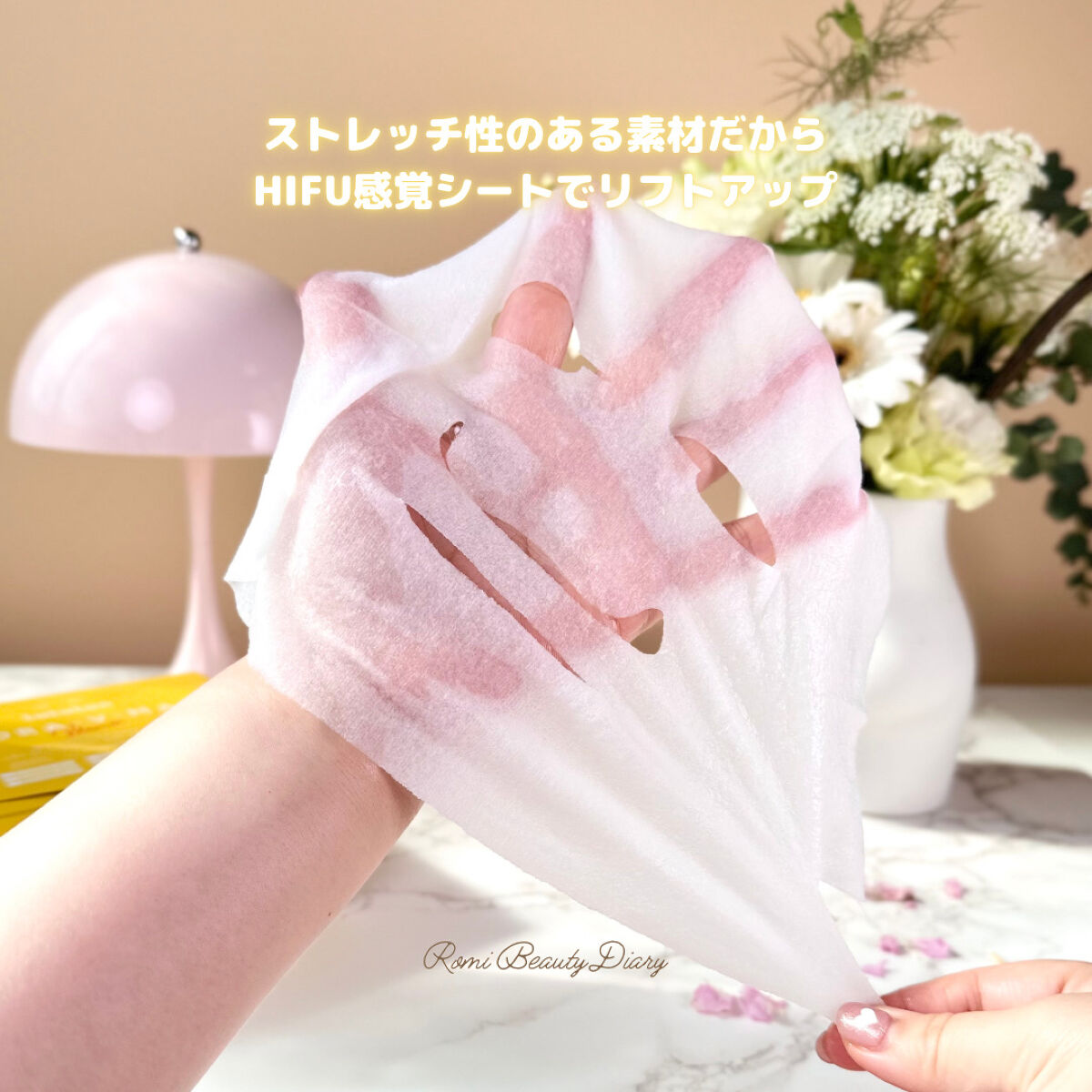新開発のHIFU(ハイフ)感覚シートでリフトアップしながら、肌の角質層までうるおいで満たします✨ シートがたぷんたぷんに満たされていました✨✨ 7種類のビタミン成分で毛穴の目立たないうるおいたっぷりの水光肌へ🌙