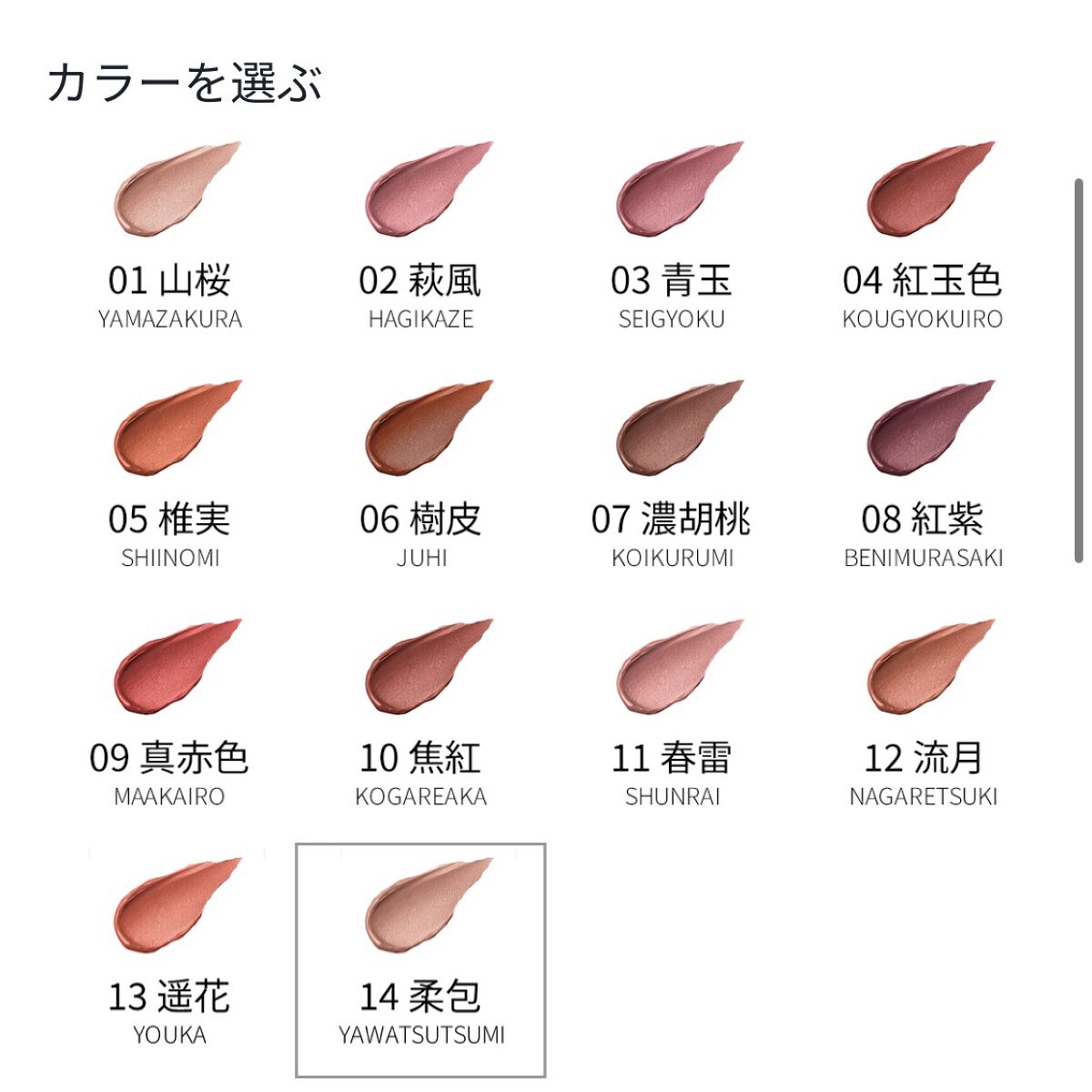 - <01 山桜> トリ(カプリル酸/カプリン酸)グリセリル、イソノナン酸イソトリデシル、ワセリン、水添ポリイソブテン、オクチルドデカノール、ラウロイルグルタミン酸ジ(オクチルドデシル/フィトステリル/ベヘニル)、パラフィン、マイクロクリスタリンワックス、ヒドロキシステアリン酸水添ヒマシ油、合成ワックス、ラウロイルグルタミン酸ジ(フィトステリル/オクチルドデシル)、ヒドロキシステアリン酸エチルヘキシル、水添マイクロクリスタリンワックス、リンゴ酸ジイソステアリル、トコフェロール、(エチレン/プロピレン)コポリマー、ポリエチレン、ジメチコン、オリーブ果実油、アーモンド油、ヒアルロン酸Na、(+/-)(チタン/酸化チタン)焼結物、シリカ、セルロース、マイカ、ラウロイルアスパラギン酸Na、ラウロイルリシン、塩化亜鉛、酸化チタン、酸化鉄、水酸化Al、硫酸Ba、トリイソステアリン酸イソプロピルチタン、トリエトキシカプリリルシラン、合成フルオロフロゴパイト、青1、赤104(1)、赤201、赤202 <02 萩風> トリ(カプリル酸/カプリン酸)グリセリル、イソノナン酸イソトリデシル、ワセリン、水添ポリイソブテン、オクチルドデカノール、ラウロイルグルタミン酸ジ(オクチルドデシル/フィトステリル/ベヘニル)、パラフィン、マイクロクリスタリンワックス、ヒドロキシステアリン酸水添ヒマシ油、合成ワックス、ラウロイルグルタミン酸ジ(フィトステリル/オクチルドデシル)、ヒドロキシステアリン酸エチルヘキシル、水添マイクロクリスタリンワックス、リンゴ酸ジイソステアリル、トコフェロール、(エチレン/プロピレン)コポリマー、ポリエチレン、ジメチコン、オリーブ果実油、アーモンド油、ヒアルロン酸Na、(+/-)(チタン/酸化チタン)焼結物、シリカ、セルロース、マイカ、ラウロイルアスパラギン酸Na、ラウロイルリシン、塩化亜鉛、酸化チタン、酸化鉄、水酸化Al、硫酸Ba、トリイソステアリン酸イソプロピルチタン、トリエトキシカプリリルシラン、合成フルオロフロゴパイト、青1、赤104(1)、赤201、赤202 <03 青玉> トリ(カプリル酸/カプリン酸)グリセリル、イソノナン酸イソトリデシル、ワセリン、水添ポリイソブテン、オクチルドデカノール、ラウロイルグルタミン酸ジ(オクチルドデシル/フィトステリル/ベヘニル)、パラフィン、マイクロクリスタリンワックス、ヒドロキシステアリン酸水添ヒマシ油、合成ワックス、ラウロイルグルタミン酸ジ(フィトステリル/オクチルドデシル)、ヒドロキシステアリン酸エチルヘキシル、水添マイクロクリスタリンワックス、リンゴ酸ジイソステアリル、トコフェロール、(エチレン/プロピレン)コポリマー、ポリエチレン、ジメチコン、オリーブ果実油、アーモンド油、ヒアルロン酸Na、(+/-)(チタン/酸化チタン)焼結物、シリカ、セルロース、マイカ、ラウロイルアスパラギン酸Na、ラウロイルリシン、塩化亜鉛、酸化チタン、酸化鉄、水酸化Al、硫酸Ba、トリイソステアリン酸イソプロピルチタン、トリエトキシカプリリルシラン、合成フルオロフロゴパイト、青1、赤104(1)、赤201、赤202 <04 紅玉色> トリ(カプリル酸/カプリン酸)グリセリル、イソノナン酸イソトリデシル、ワセリン、水添ポリイソブテン、オクチルドデカノール、ラウロイルグルタミン酸ジ(オクチルドデシル/フィトステリル/ベヘニル)、パラフィン、マイクロクリスタリンワックス、ヒドロキシステアリン酸水添ヒマシ油、合成ワックス、ラウロイルグルタミン酸ジ(フィトステリル/オクチルドデシル)、ヒドロキシステアリン酸エチルヘキシル、水添マイクロクリスタリンワックス、トコフェロール、(エチレン/プロピレン)コポリマー、ポリエチレン、オリーブ果実油、アーモンド油、ヒアルロン酸Na、(+/-)(チタン/酸化チタン)焼結物、シリカ、セルロース、マイカ、ラウロイルアスパラギン酸Na、ラウロイルリシン、塩化亜鉛、酸化チタン、酸化鉄、硫酸Ba、トリイソステアリン酸イソプロピルチタン、含水シリカ、合成フルオロフロゴパイト、黄4、黄5、赤201、赤202 <05 椎実> トリ(カプリル酸/カプリン酸)グリセリル、イソノナン酸イソトリデシル、ワセリン、水添ポリイソブテン、オクチルドデカノール、ラウロイルグルタミン酸ジ(オクチルドデシル/フィトステリル/ベヘニル)、パラフィン、マイクロクリスタリンワックス、ヒドロキシステアリン酸水添ヒマシ油、合成ワックス、ラウロイルグルタミン酸ジ(フィトステリル/オクチルドデシル)、ヒドロキシステアリン酸エチルヘキシル、水添マイクロクリスタリンワックス、リンゴ酸ジイソステアリル、トコフェロール、(エチレン/プロピレン)コポリマー、ポリエチレン、オリーブ果実油、アーモンド油、ヒアルロン酸Na、(+/-)(チタン/酸化チタン)焼結物、シリカ、セルロース、マイカ、ラウロイルアスパラギン酸Na、ラウロイルリシン、塩化亜鉛、酸化鉄、硫酸Ba、トリイソステアリン酸イソプロピルチタン、トリエトキシカプリリルシラン、合成