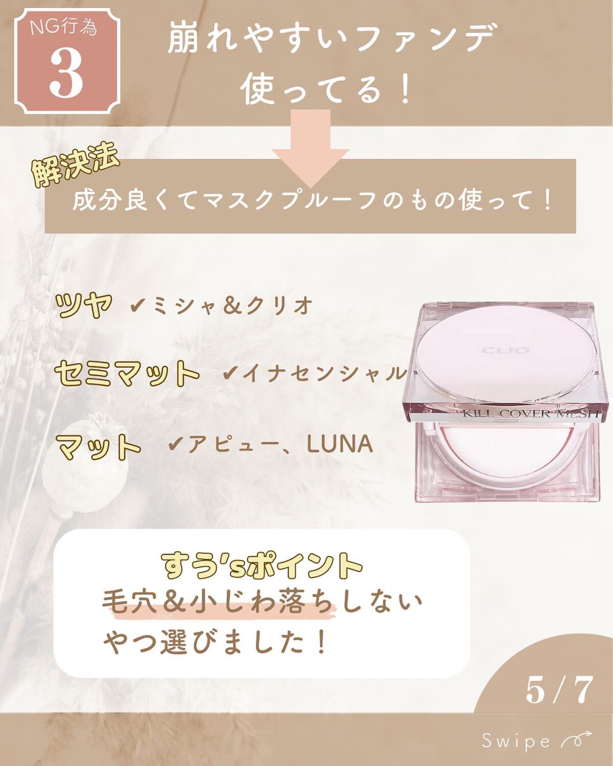 混合肌の私のイチオシはコスノリです!これをつけているととくに肌綺麗だねって言われます! いつもイニスフリーのパウダーでマットっぽく仕上げて、時間が経つと自然にコスノリのツヤが出ているのだと感じます! 崩したくない、マットにしたい日はマニョ、素肌感がほしい時はナンバーズインかなと思います!