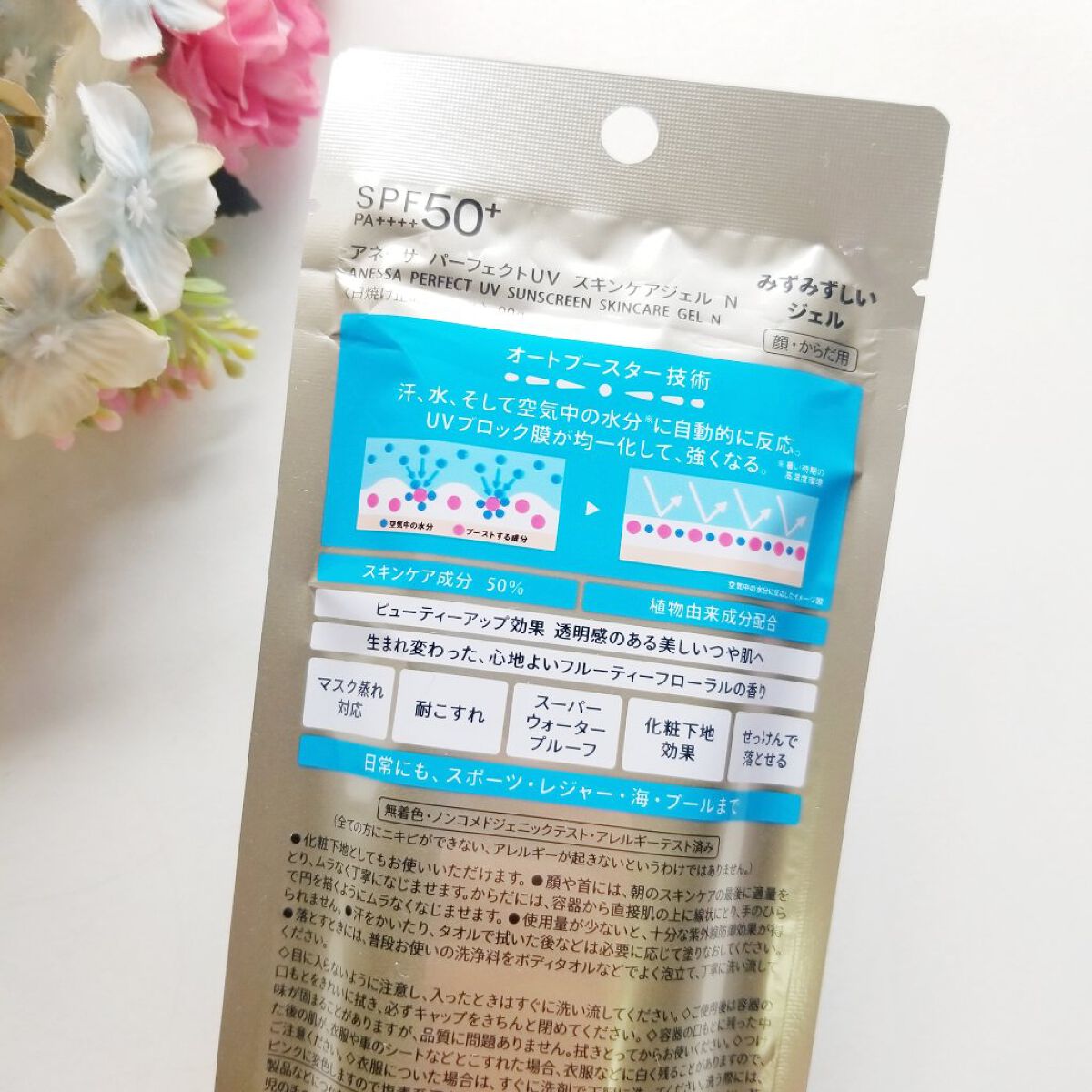 - SPF50+ ・ PA++++ 顔・ から だ用 汗、水、そして空気中の水分※10 に反応してUVブロック膜が強くなる技術搭載 毎日つけたくなる みずみずしいスキンケア UVジェル ※10 暑い時期の高湿度環境 〇汗、水、そして空気中の水分に自動的に反応して 、 UVブロック膜が 強くなります 。-オートブースタ ー 技術 〇透明美肌仕上げ-ビューティ ー アップ 〇スキンケア成分50%配合 〇保湿成分:コラーゲン、スーパーヒアルロン酸※9、グリセリン ※9 アセチルヒアルロン酸Na 〇長時間保湿持続効果 〇スーパーウォータープルーフ 〇マスク蒸れ対応 〇耐こすれ 〇化粧下地効果 〇せっけんで落とせる 〇みずみずしいジェル 〇生まれ変わった、心地よいフルーティーフローラルの香り 〇大気中に浮遊する微粒子、PM2.5などから肌を保護します。 -微粒子付着防止対応 〇海に流れ出にくいオーシャンフレンドリー処方※6 ※6 自社品内の耐水処方でない商品と比較 〇植物由来の原料を一部使用した袋 〇無着色・ノンコメドジェニックテスト・アレルギーテスト済み (全ての方にニキビができない、アレルギーが起きないというわけではありません)