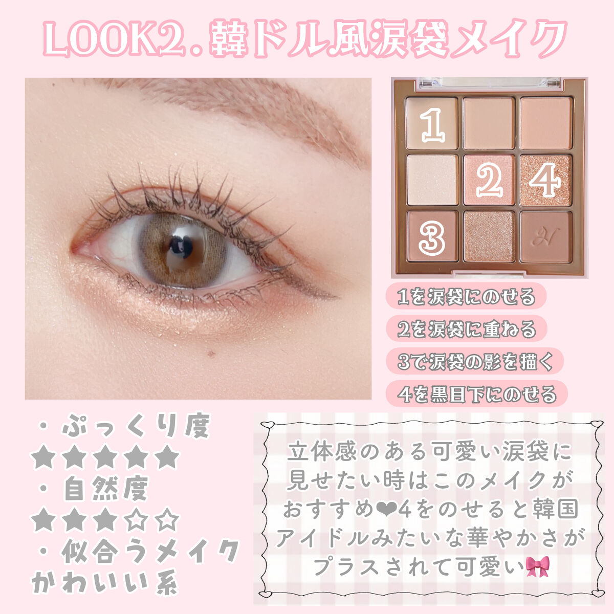 - 涙袋用コンシーラー入りの9色アイシャドウパレット。涙袋用コンシーラーや涙袋の影カラー、涙袋を立体的にみせるハイピグメントのラメやハイライターが入った9色パレットです。これ1つで様々なニュアンスの「涙袋メイク」や「下まぶたメイク」を楽しめます。