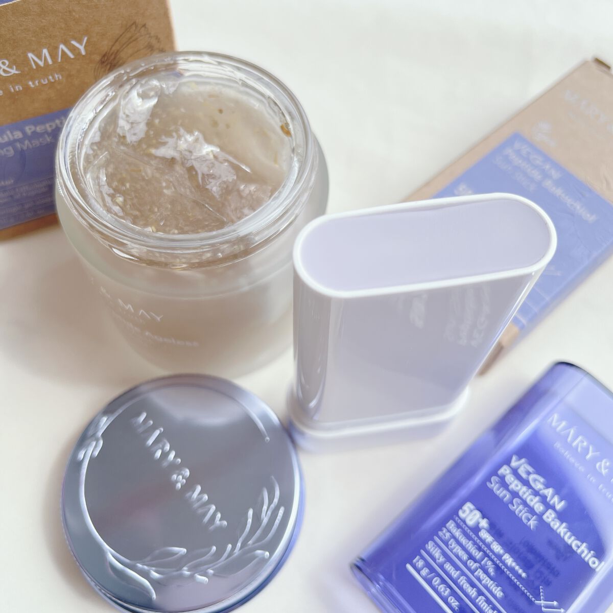 Jumiso AWE・SUN AIRY-FIT SPF50+ PA++++ みずみずしいテクスチャーで伸びがよく しっとりした使い心地。 MARY&MAY ヴィーガンペプチドバクチオール サンスティック SPF50+ PA++++ バクチオール10.000ppm、ペプチド25種類。 MARY&MAY カレンデュラペプチド エイジレススリーピングマスク 本物のカレンデュラの花びらが入ってる! 寝る前にたっぷり塗るのが良かった。 みずみずしいジェルでしっとりした使い心地。