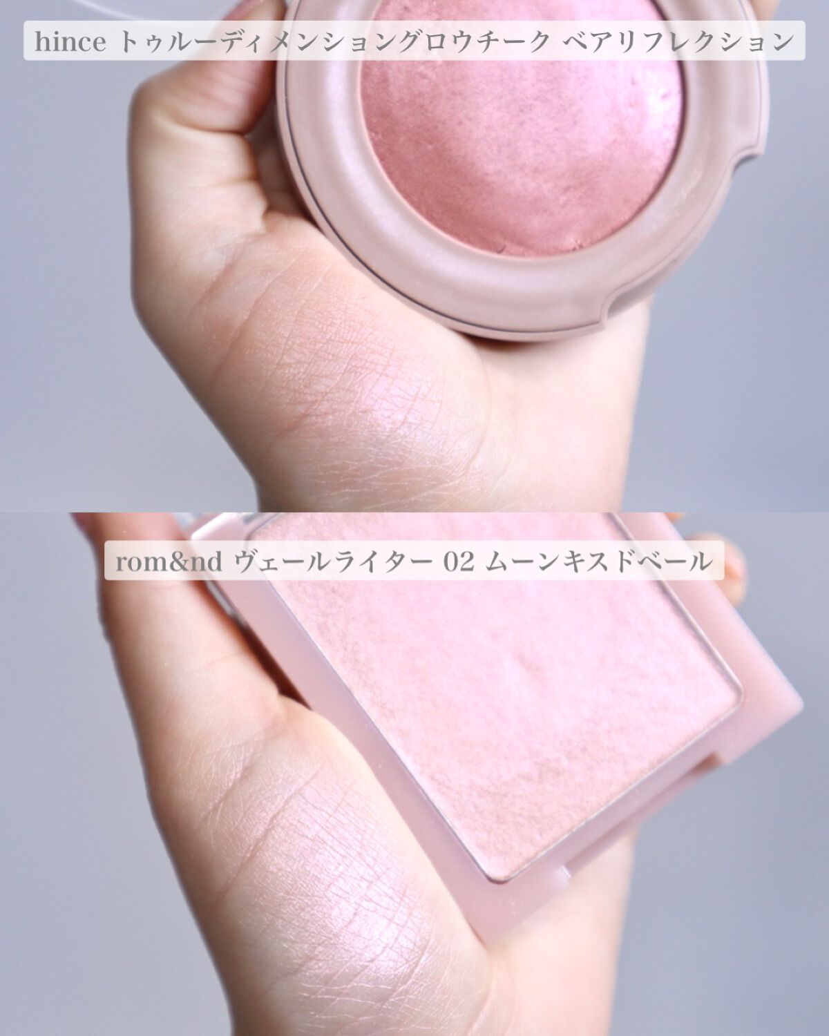 思っていたよりも小ぶりで手のひらサイズの可愛らしいサイズ感だなあという第一印象。 パウダーにはたっぷりのラメが配合されているのでお肌にのせると透明感溢れる仕上がりに。 全体的にホワイトやベージュカラーで構成されているのでハイライトカラーとしてのせるとお顔に輝きをしっかり集めてくれます! 所謂ほわほわ系のピンクに発色されます🩷