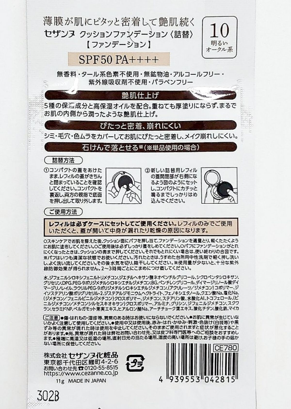 - <本体> 薄膜がぴたっと密着し艶肌続くクッションファンデ。 シミ・毛穴・色ムラをカバーしてお肌にぴたっと密着しメイク崩れしにくい。 5種の保湿成分(スクワラン、セラミドNP、ベルガモット果実エキス、ヒアルロン酸Na、アーチチョーク葉エキス)と高保湿オイルを配合。 重ねても厚塗りになりにくく、まるでお肌の内側から潤ったような艶肌仕上げ。 SPF50 PA++++。 石鹸で落とせます。(※単品使用の場合) <パフ> セザンヌのクッションファンデーションに使える替パフ2個入。 広い面や細部までも使いやすいしずく型パフで、ファンデーションをムラなくきれいに仕上げます。 クッション面にパフを押し当て、ファンデーションを適量とり、軽くたたくようにお肌に塗布してください。 ※汚れたときは、うすめた台所用中性洗剤で軽く押し洗いをし、よく洗い流してください。その後水気を切り、陰干ししてください。
