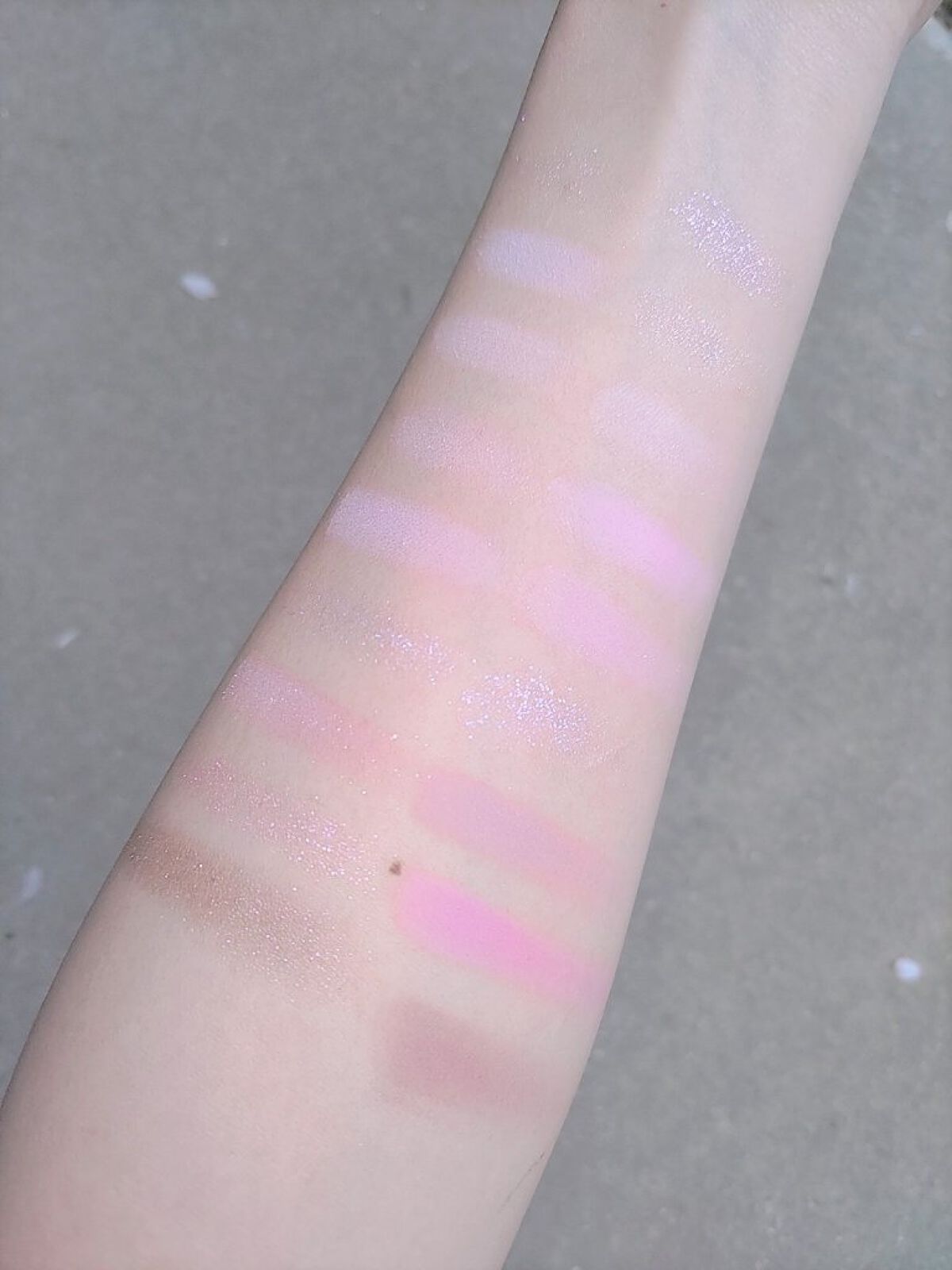 もう見た瞬間ハートの可愛さにめちゃときめいた これはもうベスコスですね! 全体的なバランスも良くてマット、ラメ、パールと一通りそろってます チークも白みのあるオレンジカラーとピーチカラー ハートの部分は白っぽいカラーとピンクっぽいカラー ピンクは結構カラーがでるのでノーズには向かないかな、頬のハイライト兼チークとしてがおすすめ