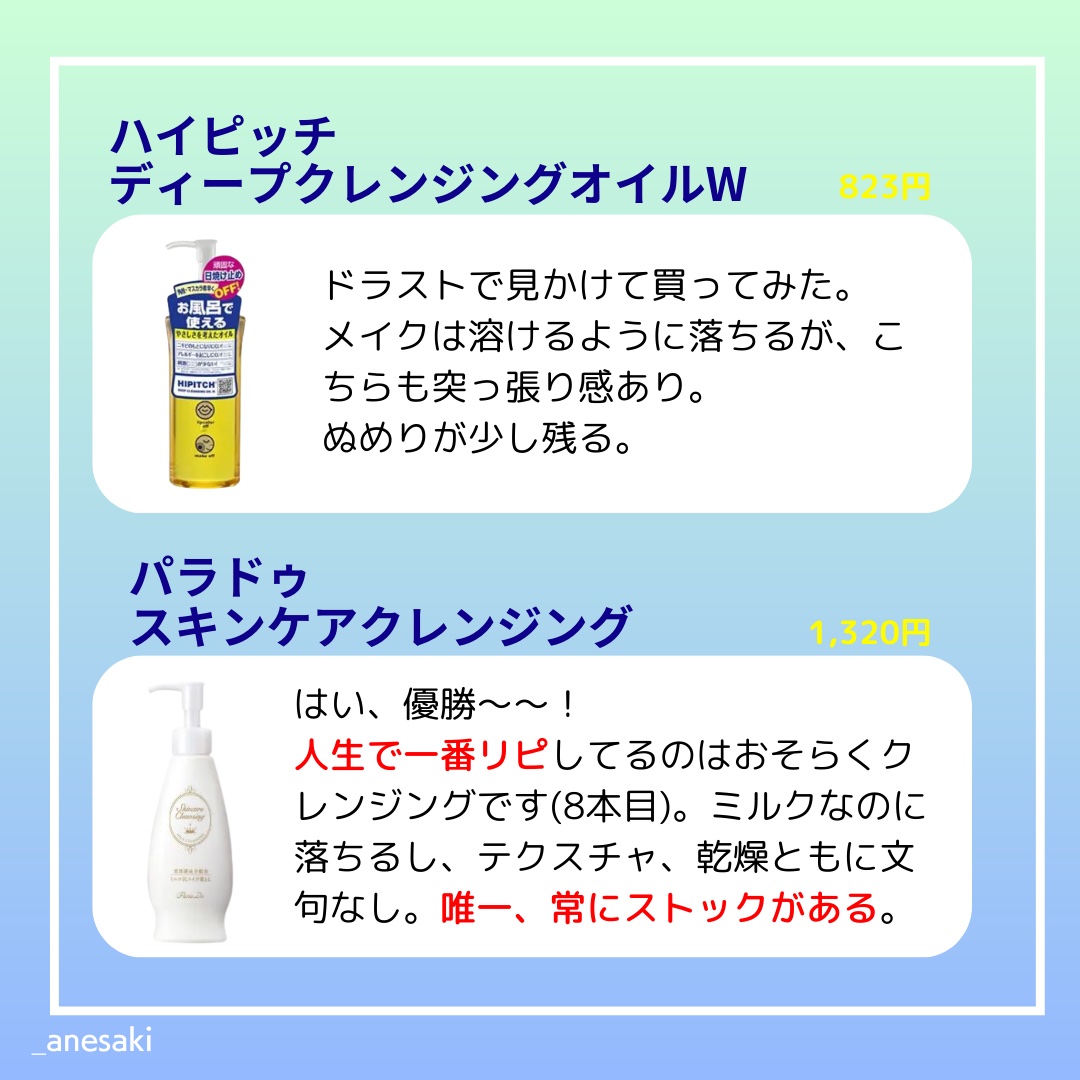 この中では一番、可もなく不可もなく。 あとこれは私だけかもしれないが、匂いも粘土っぽくて苦手。 メイクは落ちるが、使った中で一番突っ張りを感じた。 肌に優しく、オイルクレンジングはこれが一番いい。 メイクは溶けるように落ちるが、こちらも突っ張り感あり。 はい、優勝~~!ミルクなのに落ちるし、テクスチャ、乾燥ともに文句なし。唯一、常にストックがある。