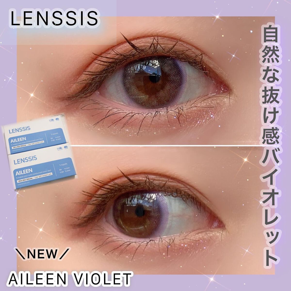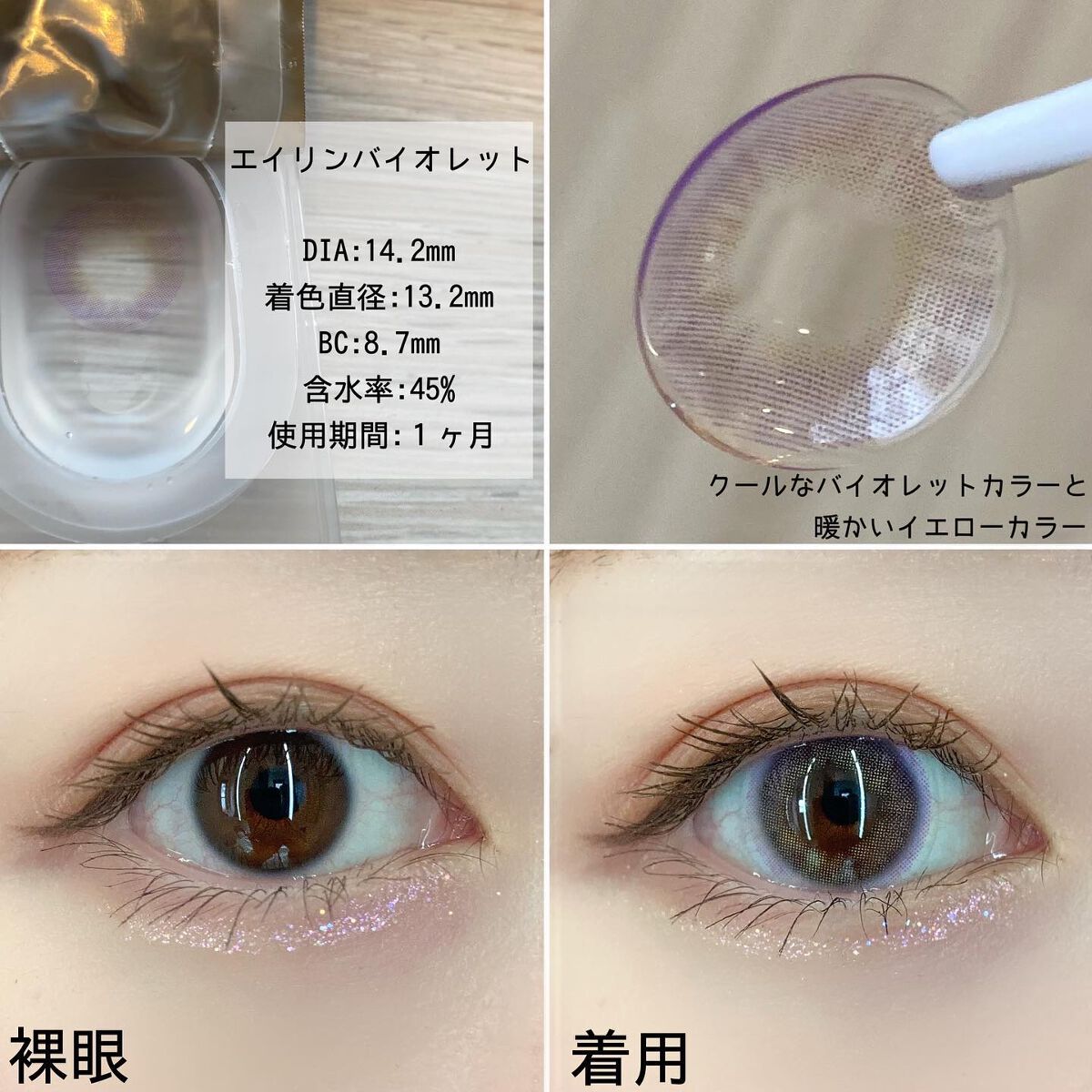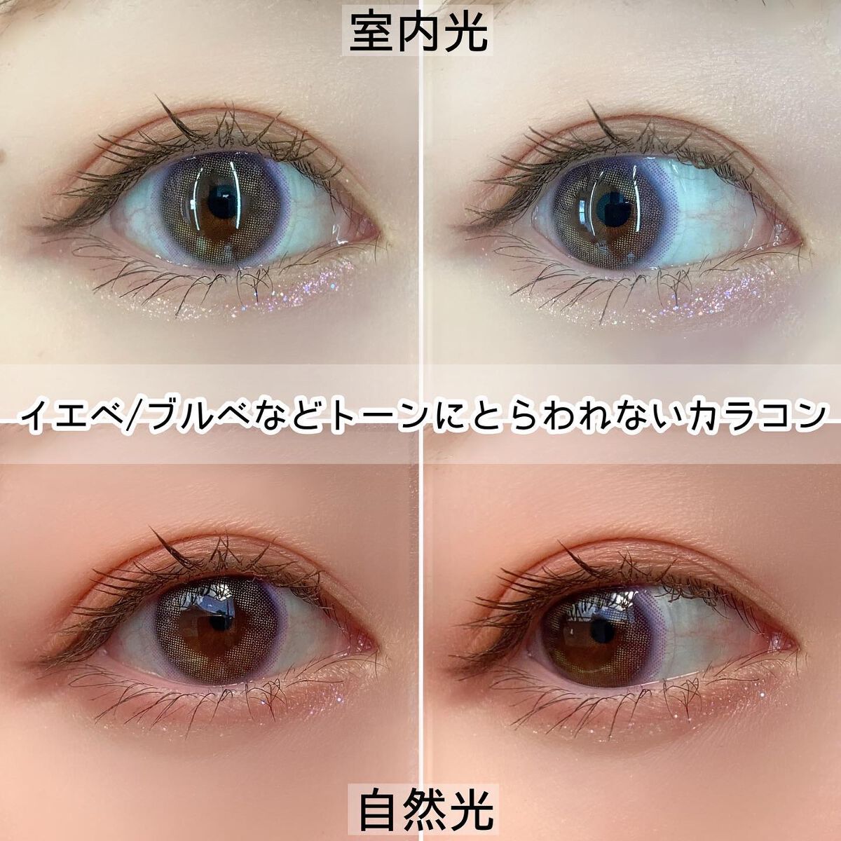 私が選んだ【バイオレット】は、瞳にじゅわっと馴染む透明感の溢れる色味だよ(∩^o^)⊃━☆゚.*。+ イエロー・ブラウン・バイオレットの3色が重なって、多彩な色彩が表現されてる💜💛🤎 暗めの場所ではバイオレット感があまり出なくて、日向とか光がよく目に入る場所だと存在感が増す◎