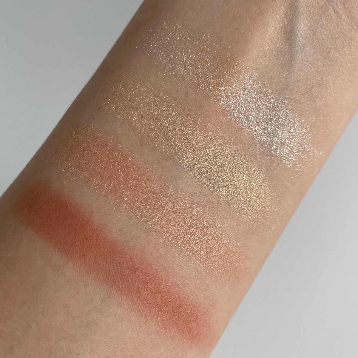 mude.の方がよりあたたかみのある印象で全体的に使いやすい色味が入っている感じ◎ ラメ感もギラギラするよりかは上品なキラキラ感✨ rom&ndはmude.に比べるとフレッシュな印象!春や夏に使うと映えそう❣️ ラメ感も強く、目立つかな。 似てるかもしれないからと買うのを長い間悩んでいましたが、仕上がりが全然変わってくるので、買って良かった😂❤️ 粉質はブランドも違うので違ったよ✨ rom&ndの方がしっとり感があって強く発色する感じ。 mude.は淡い発色で、初心者さんも使いやすいと思った🫶🏻
