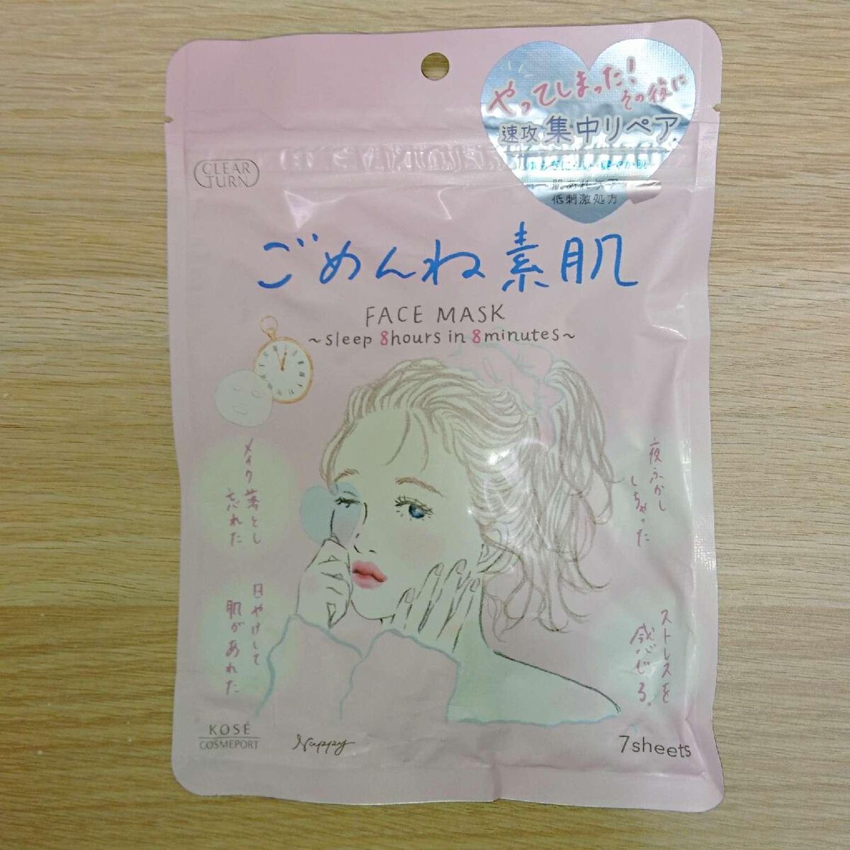 - 【クリアターン ごめんね素肌マスク】 負担をかけて、あれてしまった肌の素肌環境※1をととのえる“速攻集中リペア※2マスク”です。 ① あれがちな肌を素早くコンディションケア! ザクロエキス、桜エキス※3、ウメ果実エキスBG配合し、ゆらぎやすい肌環境をととのえ、肌あれをケアします。また、うるおいケア成分として、ヒアルロン酸、白キクラゲ多糖体BGを配合。外的ストレス※4や不規則な生活の影響を受けやすい肌も健やかでゆらぎにくい肌へみちびきます。 ②敏感肌も使える、弱酸性・低刺激処方 無香料・無着色・無鉱物油・アルコールフリー(エチルアルコール)・パラベンフリー・紫外線吸収剤フリー・シリコーンフリー・パッチテスト済み・アレルギーテスト済み・スティンギングテスト済み・敏感肌自覚者による連用テスト済み(すべての方にアレルギーや皮膚刺激が起きない、刺激感がないというわけではありません。すべての方の肌に合うということではありません。) ③角質ケアもできる!凸凹高密着シート コットン生まれのやわらかな肌触りのベンリーゼを使用。 表面に凸凹のエンボス加工を施しているため、密着性が高く、はがしたマスクでやさしく顔をふきとることで角質ケアもできます。 ※1 うるおい環境のこと ※2 うるおいお手入れのこと ※3 ソメイヨシノ葉エキス、ウメ果実エキスBGはウメ果実エキス・BG(保湿) ※4 乾燥による刺激のこと