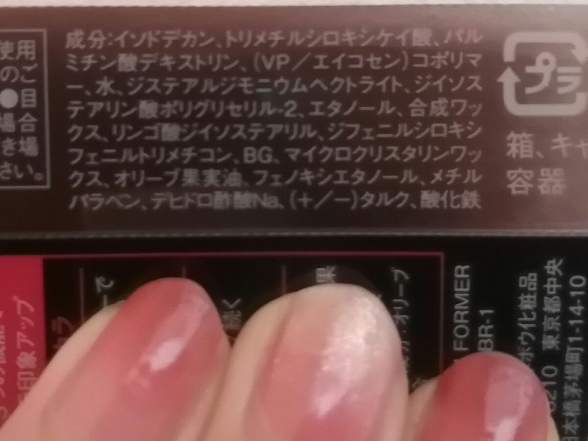- <BK-1 透明感ブラック> イソドデカン、トリメチルシロキシケイ酸、パルミチン酸デキストリン、(VP/エイコセン)コポリマー、水、ジステアルジモニウムヘクトライト、ジイソステアリン酸ポリグリセリル-2、エタノール、合成ワックス、リンゴ酸ジイソステアリル、ジフェニルシロキシフェニルトリメチコン、BG、マイクロクリスタリンワックス、オリーブ果実油、フェノキシエタノール、メチルパラベン、デヒドロ酢酸Na、(+/-)タルク、酸化鉄 <BR-1 透明感ブラウン> イソドデカン、トリメチルシロキシケイ酸、パルミチン酸デキストリン、(VP/エイコセン)コポリマー、水、ジステアルジモニウムヘクトライト、ジイソステアリン酸ポリグリセリル-2、エタノール、合成ワックス、リンゴ酸ジイソステアリル、ジフェニルシロキシフェニルトリメチコン、BG、マイクロクリスタリンワックス、オリーブ果実油、フェノキシエタノール、メチルパラベン、デヒドロ酢酸Na、(+/-)タルク、酸化鉄 <PK-1 透明感ピンクモカ> イソドデカン、トリメチルシロキシケイ酸、パルミチン酸デキストリン、(VP/エイコセン)コポリマー、水、ジステアルジモニウムヘクトライト、ジイソステアリン酸ポリグリセリル-2、エタノール、合成ワックス、リンゴ酸ジイソステアリル、ジフェニルシロキシフェニルトリメチコン、BG、マイクロクリスタリンワックス、オリーブ果実油、フェノキシエタノール、メチルパラベン、デヒドロ酢酸Na、(+/-)酸化チタン、酸化鉄、水酸化Al、合成フルオロフロゴパイト <NV-1 透明感ネイビー(限定)> イソドデカン、トリメチルシロキシケイ酸、パルミチン酸デキストリン、(VP/エイコセン)コポリマー、水、ジステアルジモニウムヘクトライト、ジイソステアリン酸ポリグリセリル-2、エタノール、リンゴ酸ジイソステアリル、ジフェニルシロキシフェニルトリメチコン、パラフィン、合成ワックス、BG、マイクロクリスタリンワックス、オリーブ果実油、フェノキシエタノール、メチルパラベン、デヒドロ酢酸Na、(+/-)グンジョウ、マイカ、酸化チタン、酸化鉄、水酸化Al、合成フルオロフロゴパイト、赤226 <PU-1 透明感パープル(限定)> イソドデカン、トリメチルシロキシケイ酸、パルミチン酸デキストリン、(VP/エイコセン)コポリマー、水、ジステアルジモニウムヘクトライト、ジイソステアリン酸ポリグリセリル-2、エタノール、リンゴ酸ジイソステアリル、ジフェニルシロキシフェニルトリメチコン、パラフィン、合成ワックス、BG、マイクロクリスタリンワックス、オリーブ果実油、フェノキシエタノール、メチルパラベン、デヒドロ酢酸Na、(+/-)グンジョウ、マイカ、酸化チタン、酸化鉄、水酸化Al、合成フルオロフロゴパイト、赤226 <BU-1 透明感ブルージュ(限定) > イソドデカン、トリメチルシロキシケイ酸、パルミチン酸デキストリン、(VP/エイコセン)コポリマー、水、ジステアルジモニウムヘクトライト、ジイソステアリン酸ポリグリセリル-2、エタノール、リンゴ酸ジイソステアリル、ジフェニルシロキシフェニルトリメチコン、パラフィン、合成ワックス、BG、マイクロクリスタリンワックス、オリーブ果実油、フェノキシエタノール、メチルパラベン、デヒドロ酢酸Na、(+/-)コンジョウ、マイカ、酸化チタン、酸化鉄、合成フルオロフロゴパイト