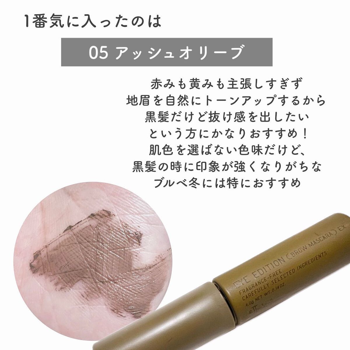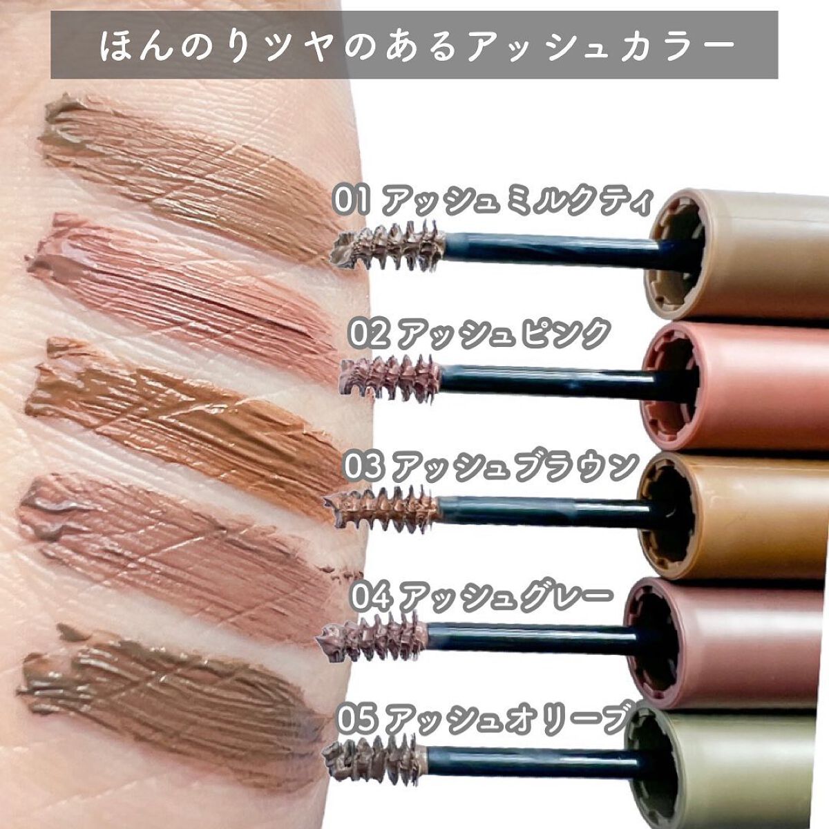 エテュセのブロウマスカラがリニューアル! トレンドの毛流れ感じる、ツヤ質感♪ アッシュ系ニュアンスカラーの眉マスカラ。 ヘアカラーに馴染みやすいアッシュカラーで小さめのブラシだから、初心者にも使いやすい✨ これからの時期に嬉しいウォータープルーフ処方◎ 私はアッシュオリーブ🫒がお気に入り🫶