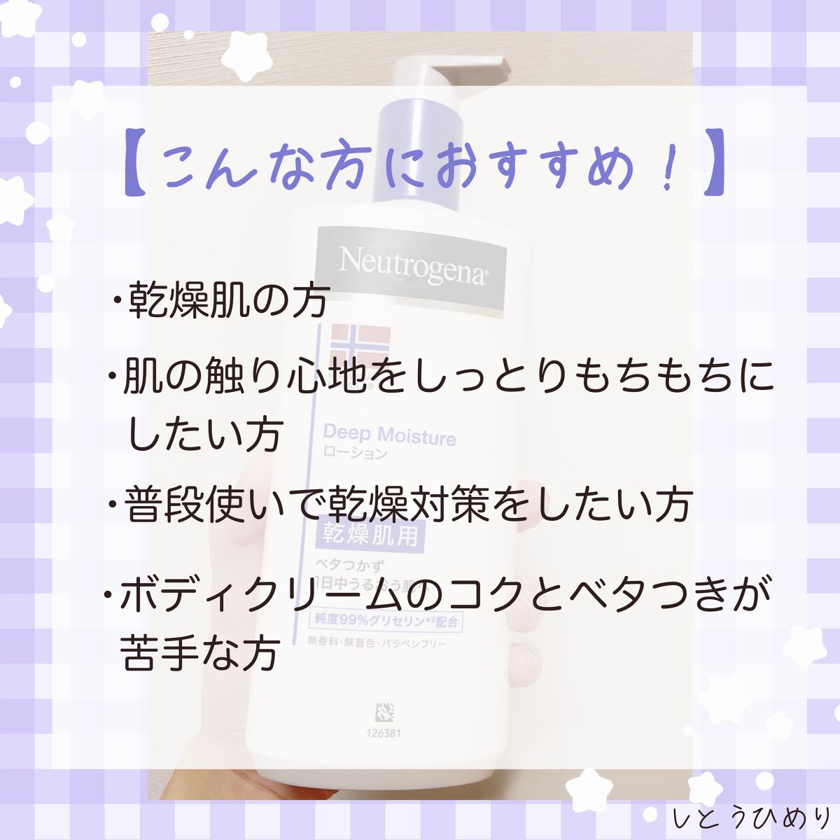 - 伸びが良くなじみやすい全身用ミルクローション(無香料) 高保湿 なめらかクリームタイプ 無香料 純度99%グリセリン*を含むニュートロジーナ®の独自処方は、1回の使用で角層10層の奥まで浸透。肌に適切な水分量を補給し、うるおいを閉じ込めて1日中キープ。 使い続けることで、美しく柔らかな肌に保ちます。 すっと肌になじんで浸透するので、ベタつきなし。すぐに衣類を着られるような使い心地で、日中の保湿にぴったり。 *保湿成分 韓国製