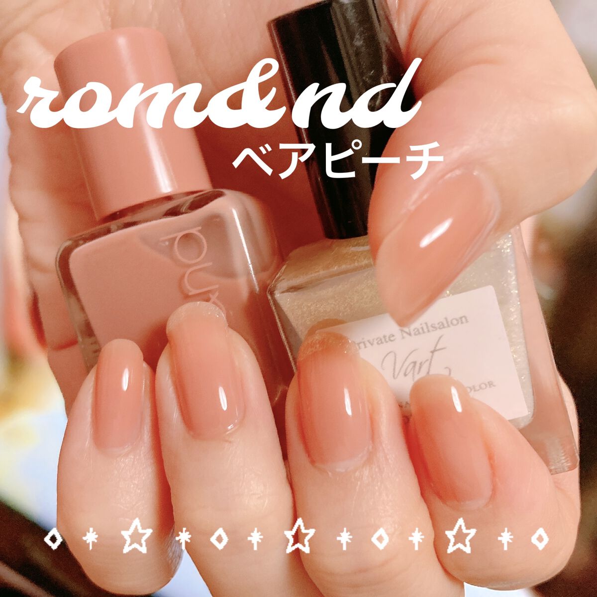 - 指先に玉石のような、ならかな光沢をとどめる。塗った瞬間から綺麗なツヤと光沢を維持し、重ねて塗っても透き通ったカラー感を鮮やかにとどめる、素早い乾燥力のナチュラルカラーネイル。「ロムアンド」の次世代型ネイルです。