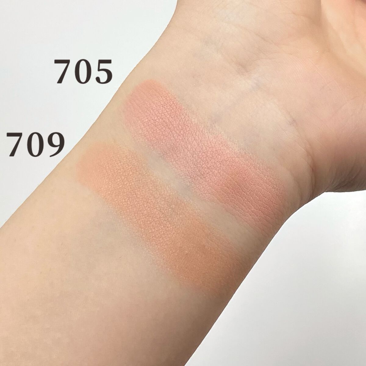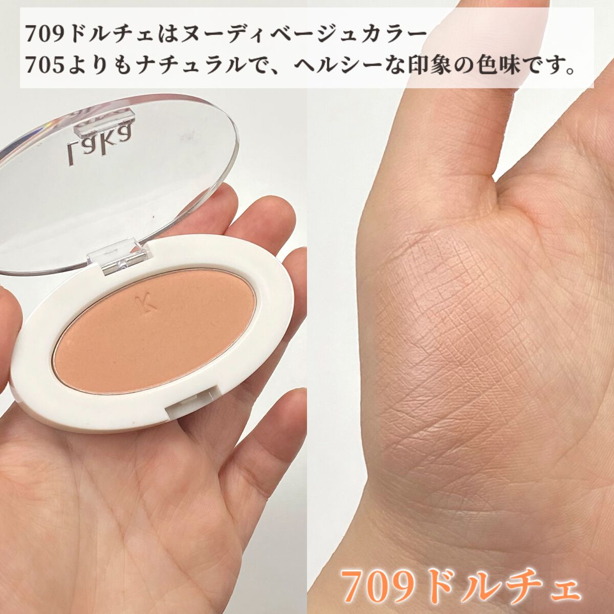 楕円形のころんとしたシルエットからして可愛らしいチーク! 709 ドルチェというヌーディベージュカラーを愛用しています✨ シルキーな質感と繊細なパール感が可愛い…🥹 ツヤ感や立体感がありながらよく肌に馴染むから、どんなメイクにも合わせやすくて完全に私の中で一軍チークです🫶