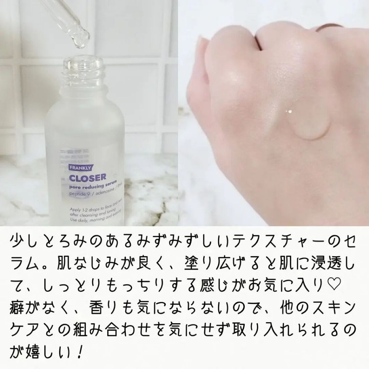 FRANKLY様からいただきました❣️香りは特に感じません。とろみのあるテクスチャーで、糸を引くほどのしっかりとしたとろみがあります。肌に塗布するとスムーズに伸び、すっとなじむように感じます。肌はしっとりとうるおい、もちもちとした手触りになる...
