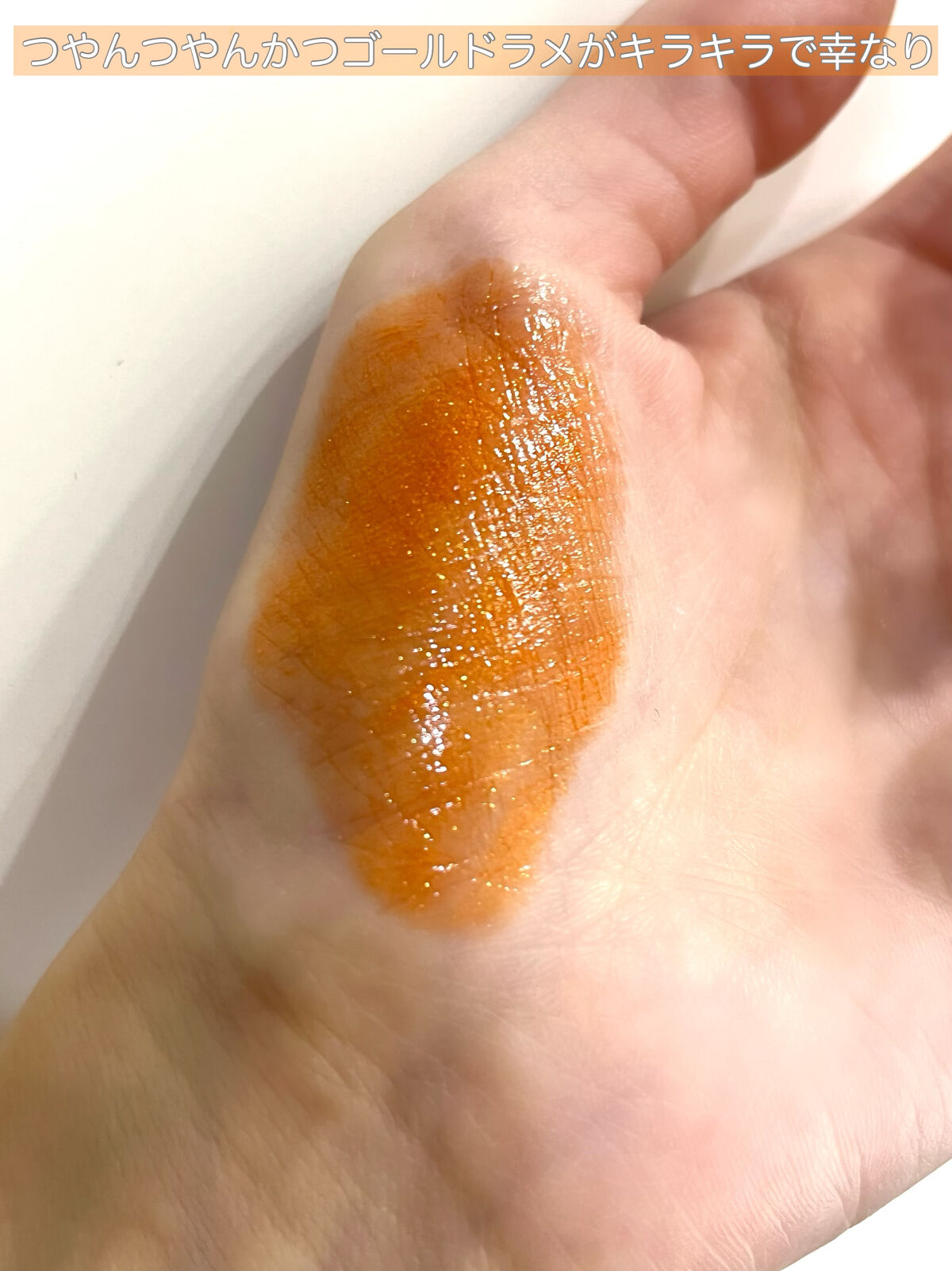 これ、めっちゃ可愛いですよ!? これから強くなる太陽の日差しを浴びれば、 リップ中に含まれるゴールドラメが反射して、 さらに可愛さが増すと思います…☀️💕 色味は黄色よりで彩度高めのオレンジ色です。 その中にゴールドのラメがいっぱい入ってて もうキラキラ…🥹✨️ ティッシュオフしても、食事しても色味が残る しっかり発色のリップです! 見つけたらぜひGETしてもらいたいリップです💄✨